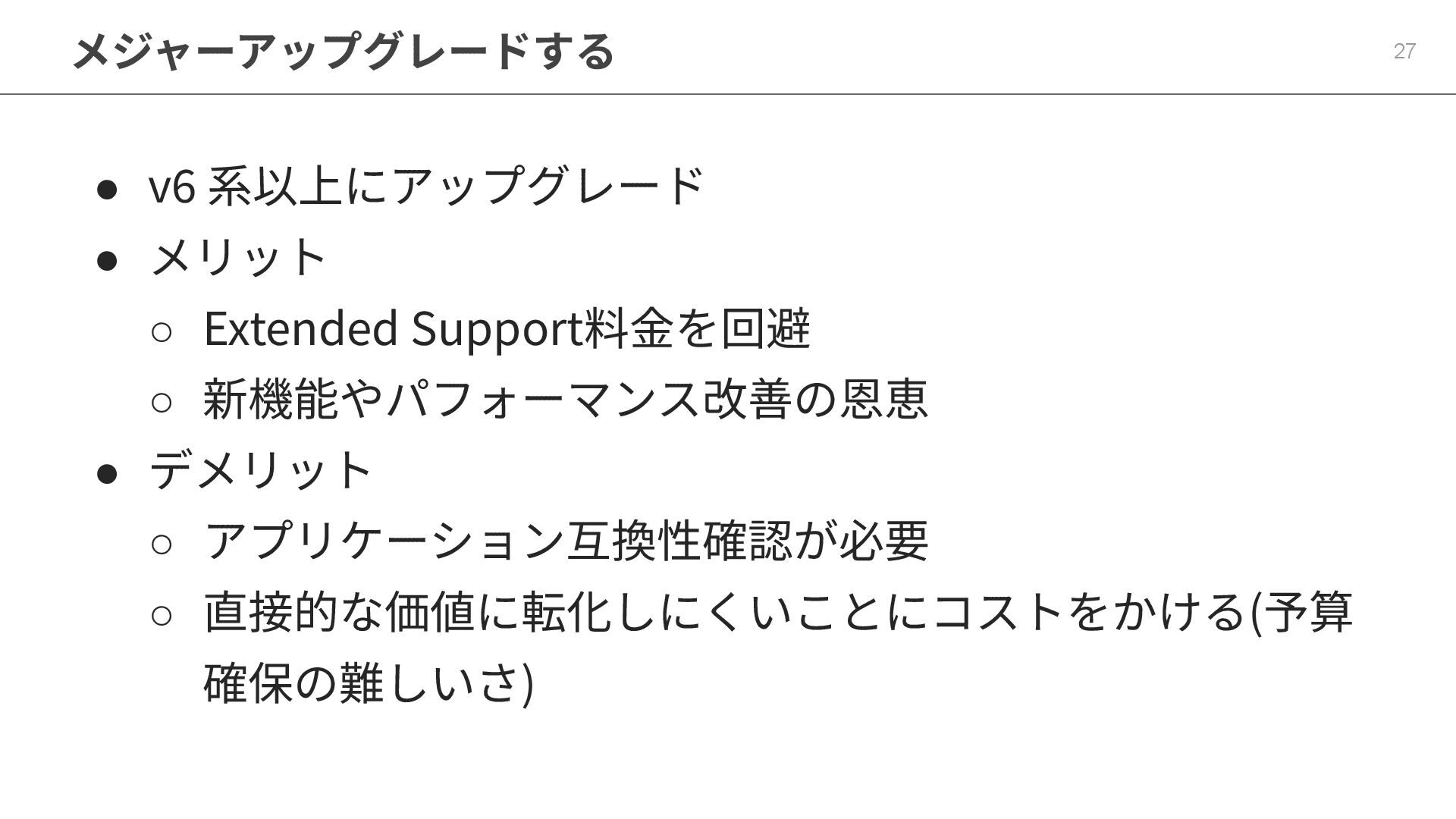 ◦ 新機能やパフォーマンス改善の恩恵 • デメリット ◦ アプリケーション互換性確認が必要 ◦ 直接的な価値に転換しにくいことにコストをかける(予算 確保の難しいさ)