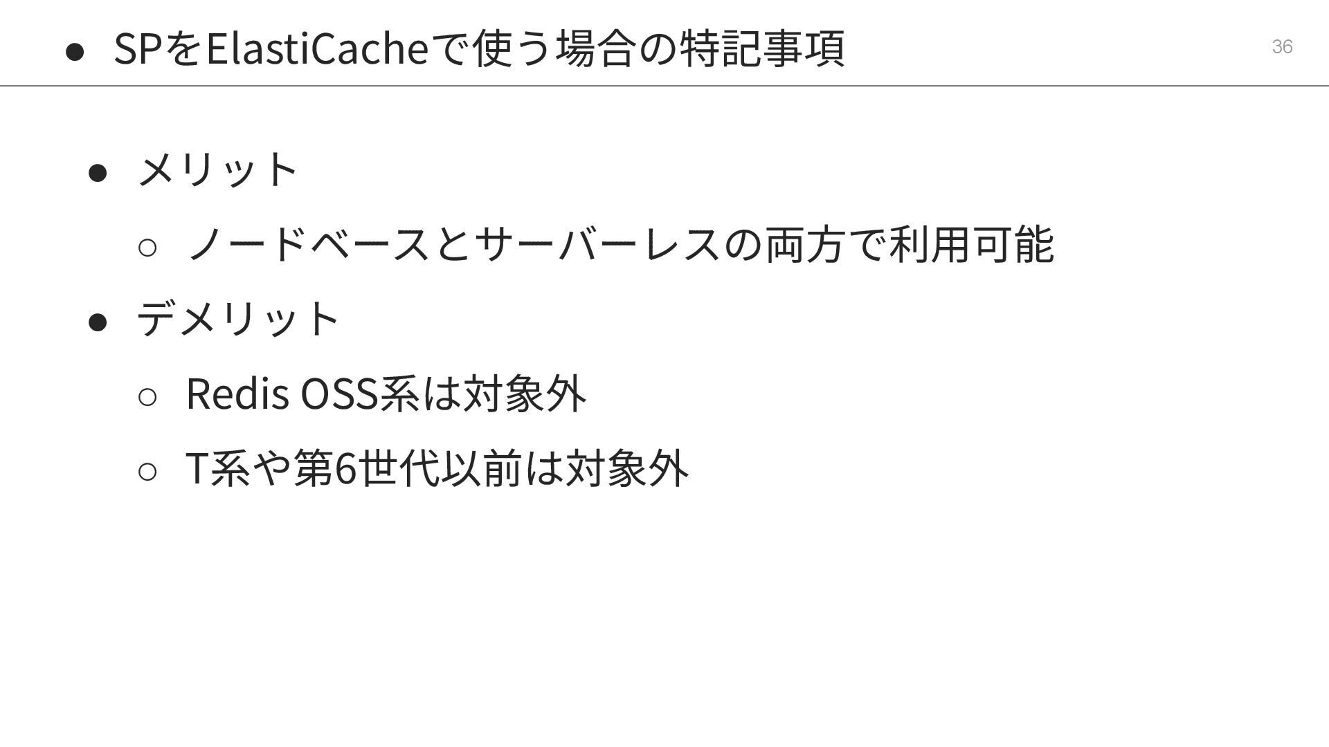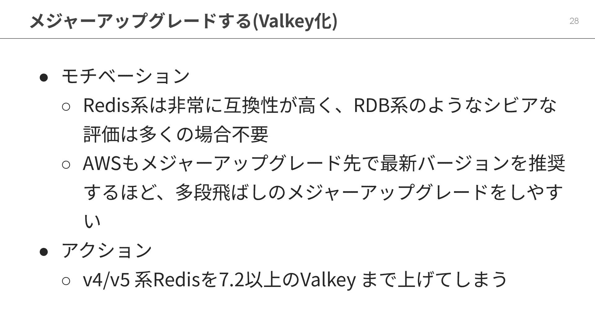 Redis OSS系を使っている場合 ◦ RIを使っている場合、切れたタイミングでValkey化 & RI/SP継続 ◦ RIを使っていない場合、Valkey化 & RI/SP導⼊ • 古いインスタンスタイプを使っている場合 ◦ 性能改善や将来のSP購⼊を⾒越して、第7世代(cache.r7g等)以降へ移⾏ • サーバーレス化のハードル ◦ ElastiCache Serverlessはノード単位ではなく、クラスター単位でサーバー レス化されているため、クラスターの作り直しを伴う