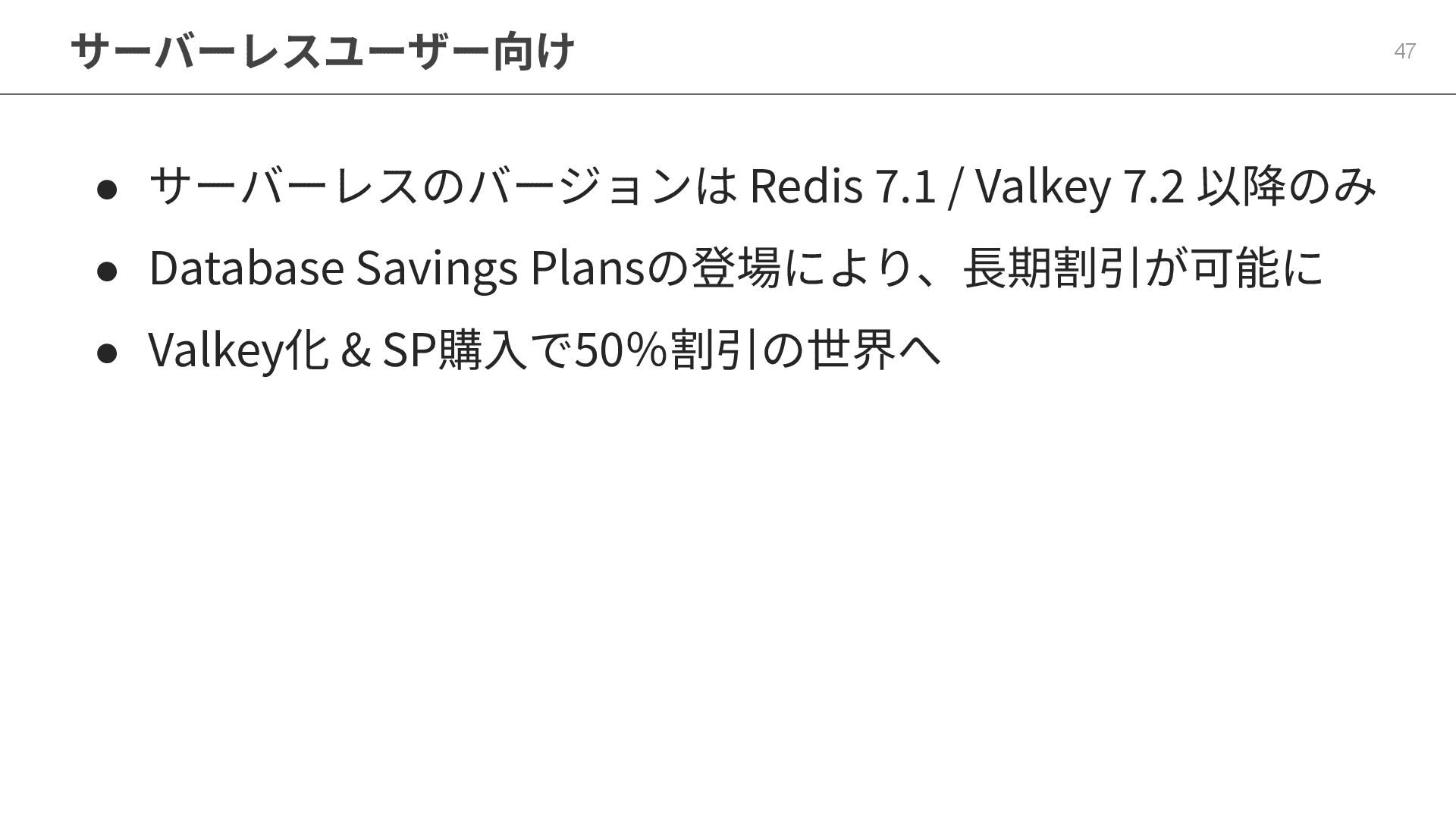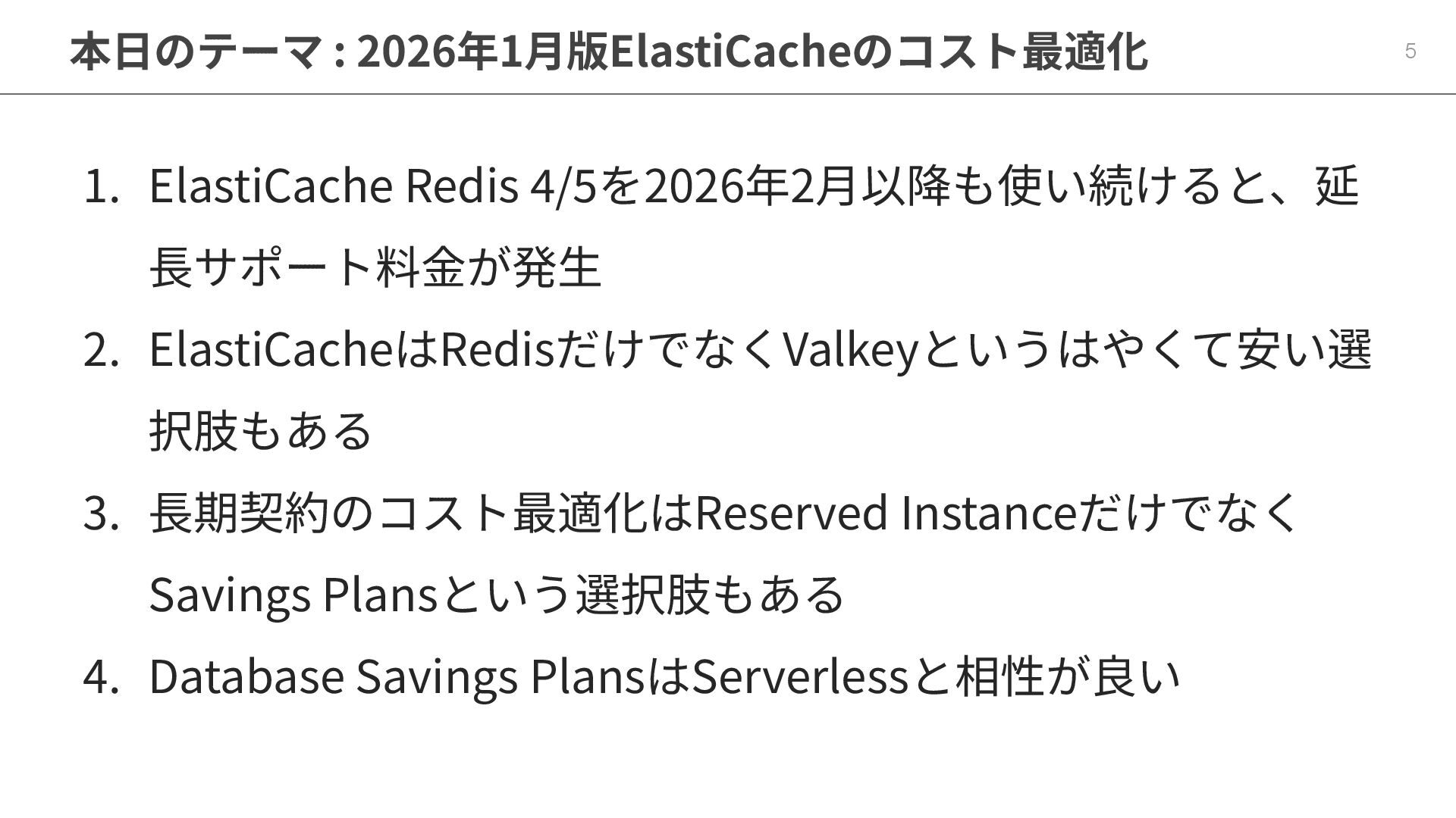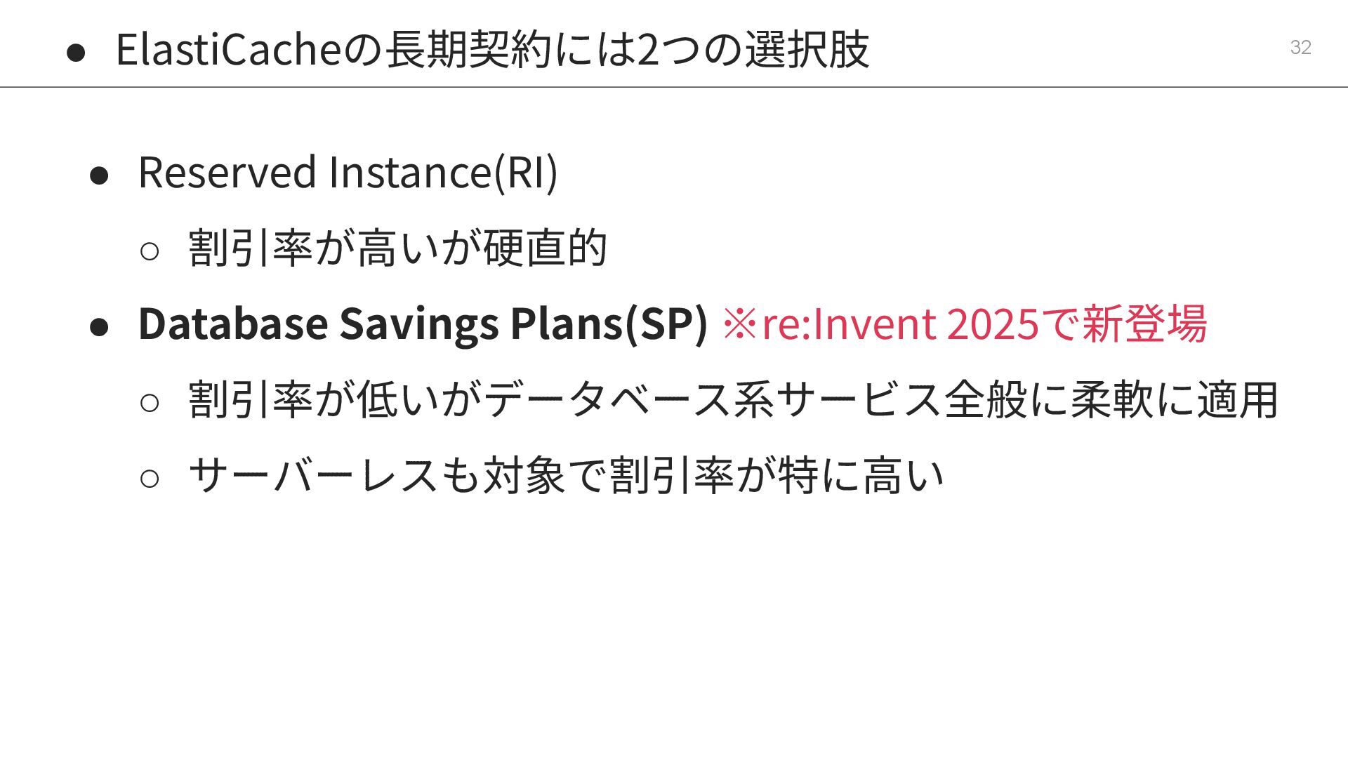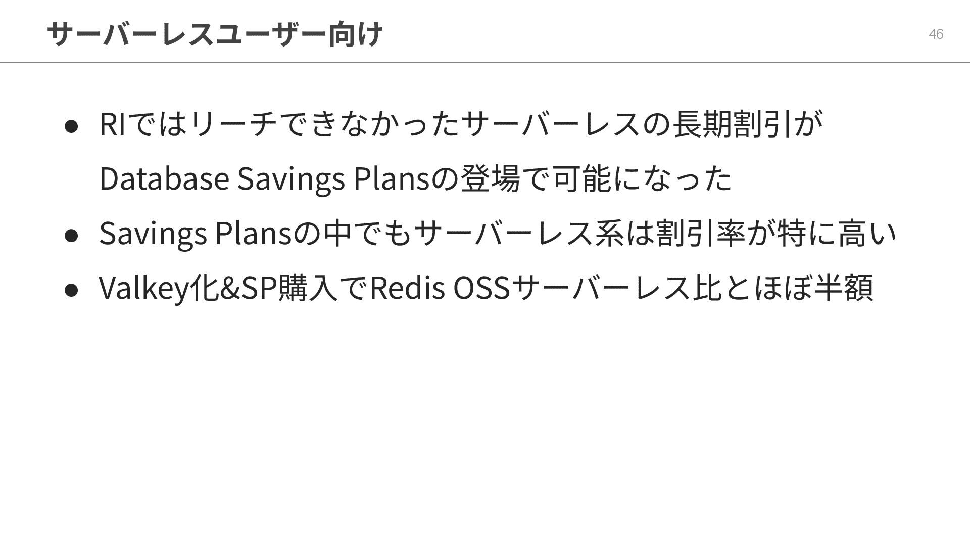ElastiCacheはRedisだけでなくValkeyというはやくて安い選 択肢もある 3. ⻑期契約のコスト最適化はReserved Instanceだけでなく Savings Plansという選択肢もある 4. Database Savings PlansはServerlessと相性が良い