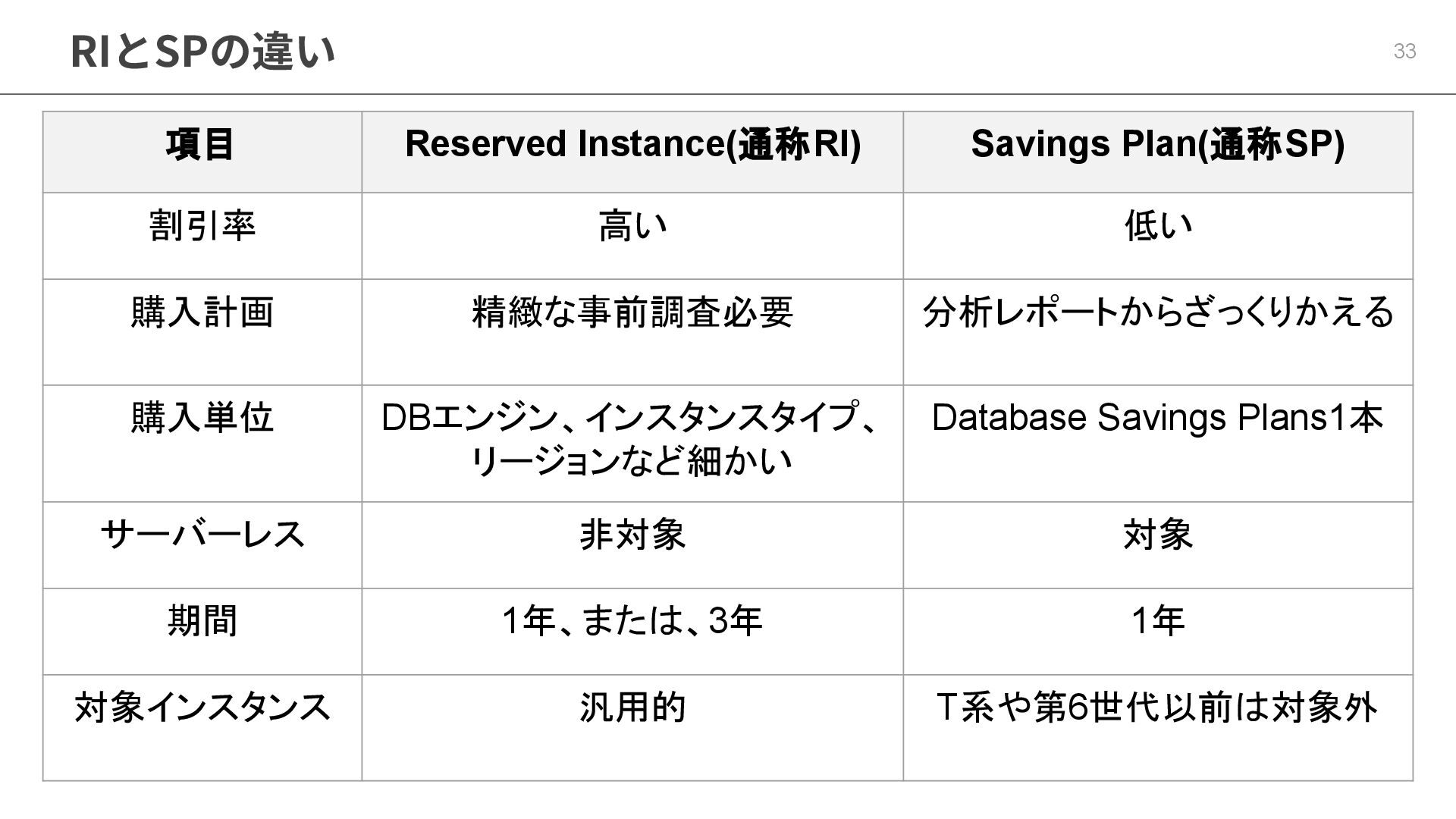 10. RIとSPの違い 32 項目 Reserved Instance(通称RI) Savings Plan(通称SP) 適用対象 DBエンジン、インスタンスタイプ、 リージョンなど細かい