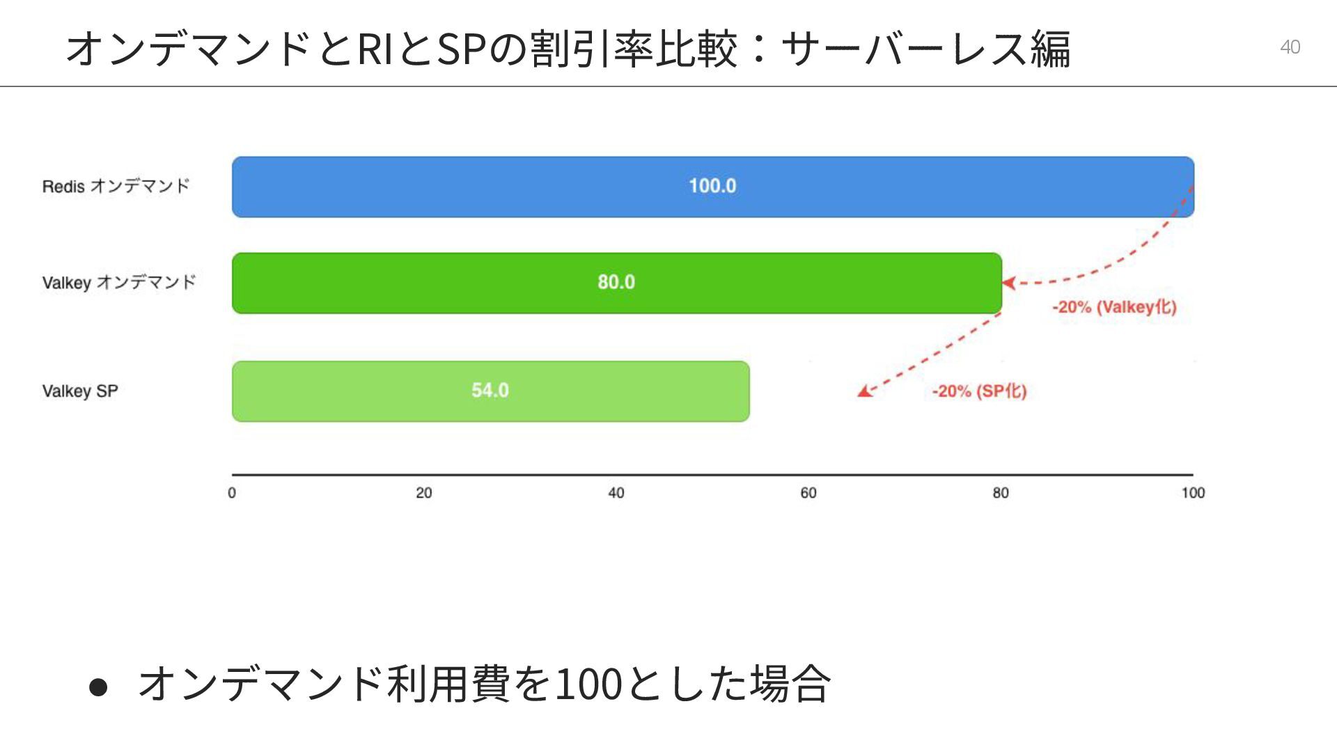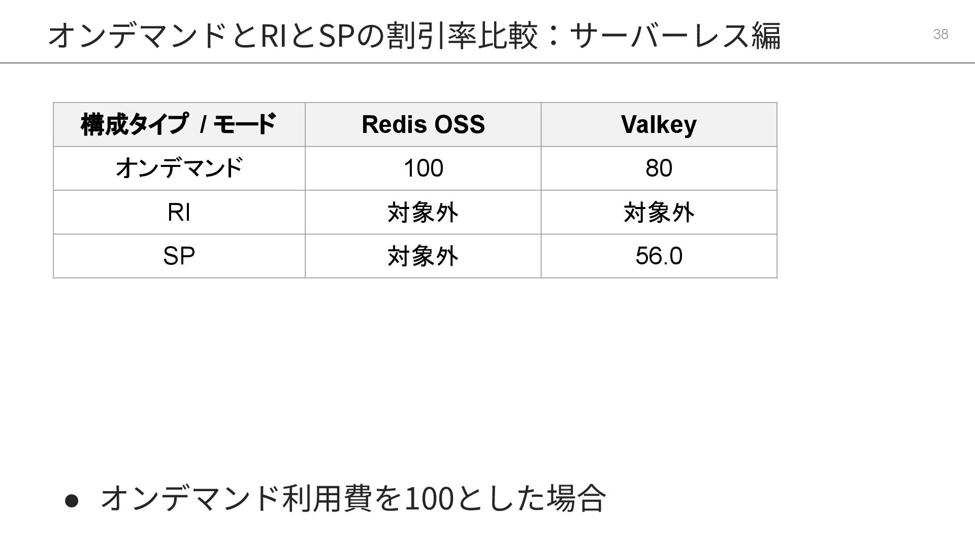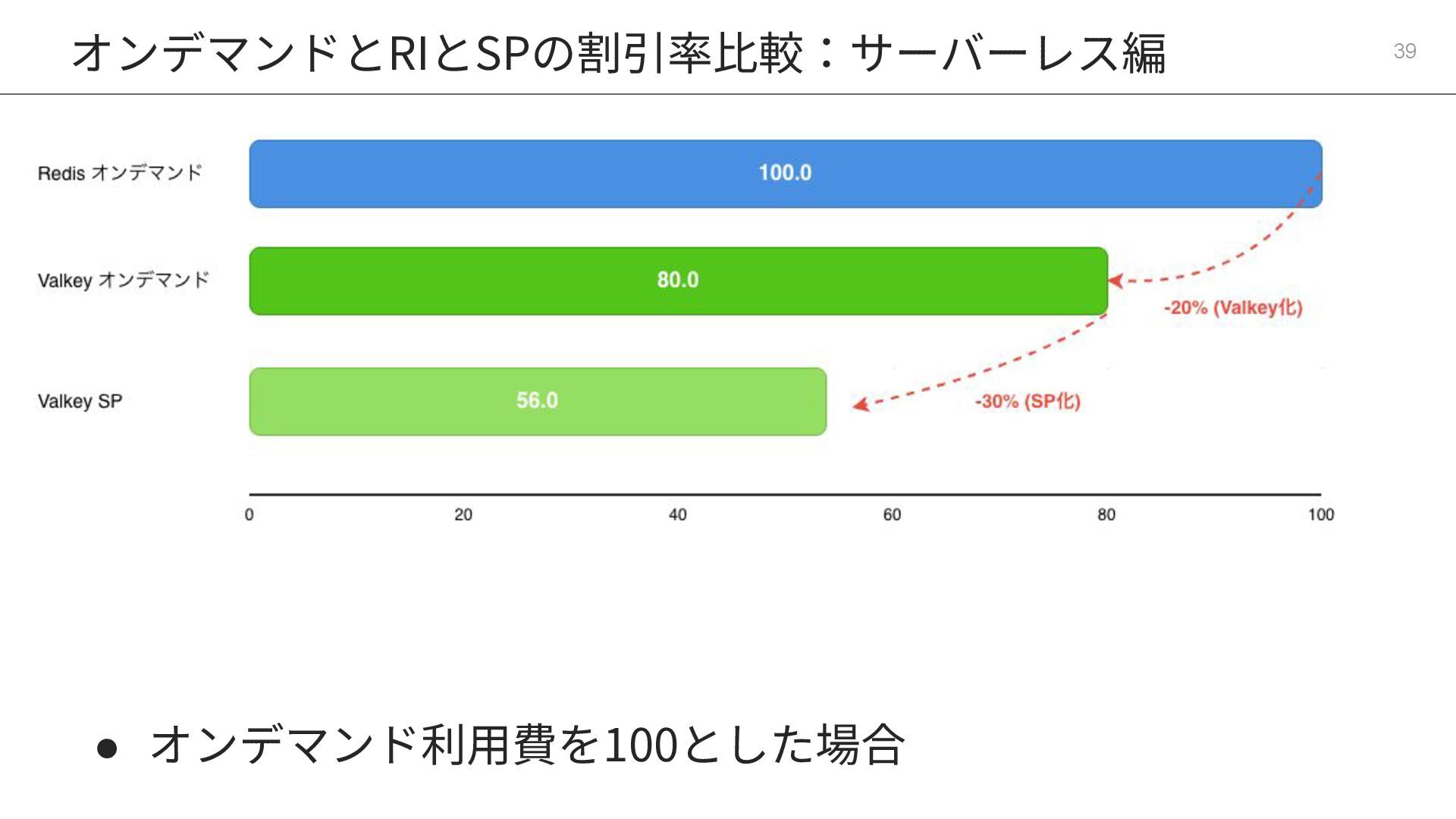 13. オンデマンドとRIとSPの割引率⽐較:サーバーレス編 38 構成タイプ / モード Redis OSS Valkey オンデマンド 100