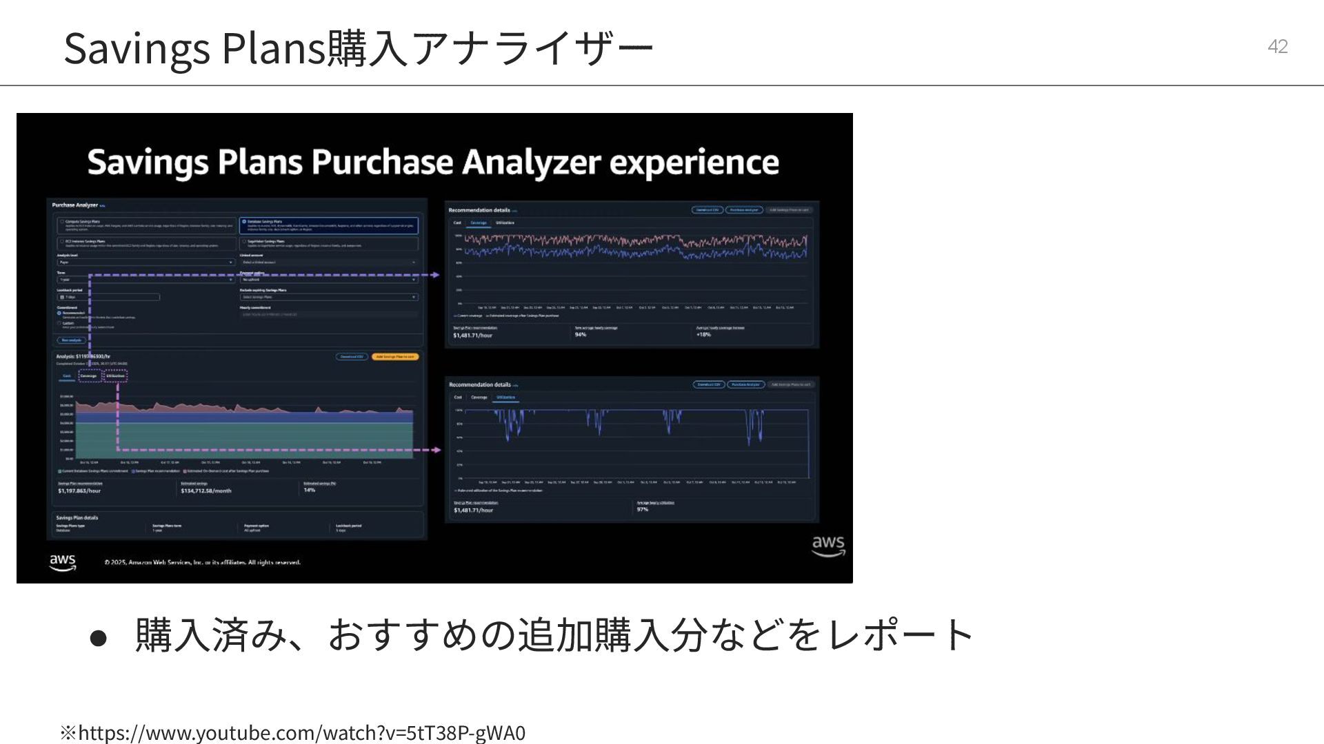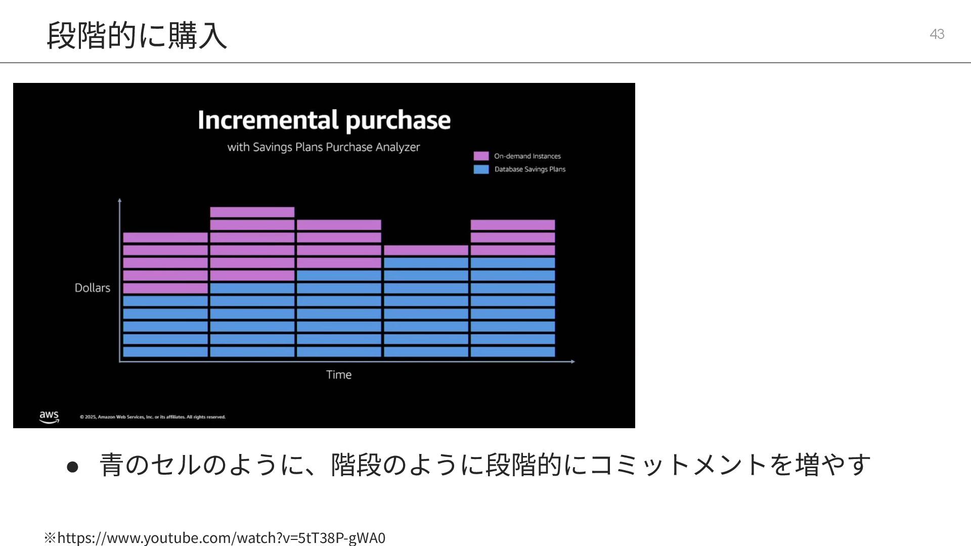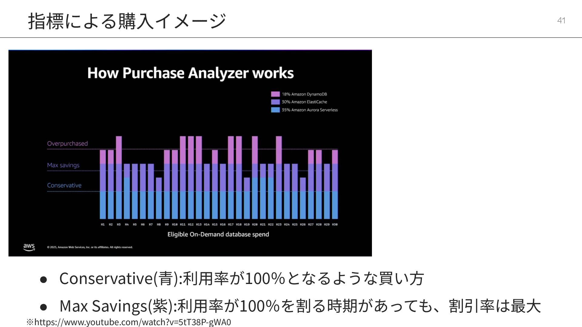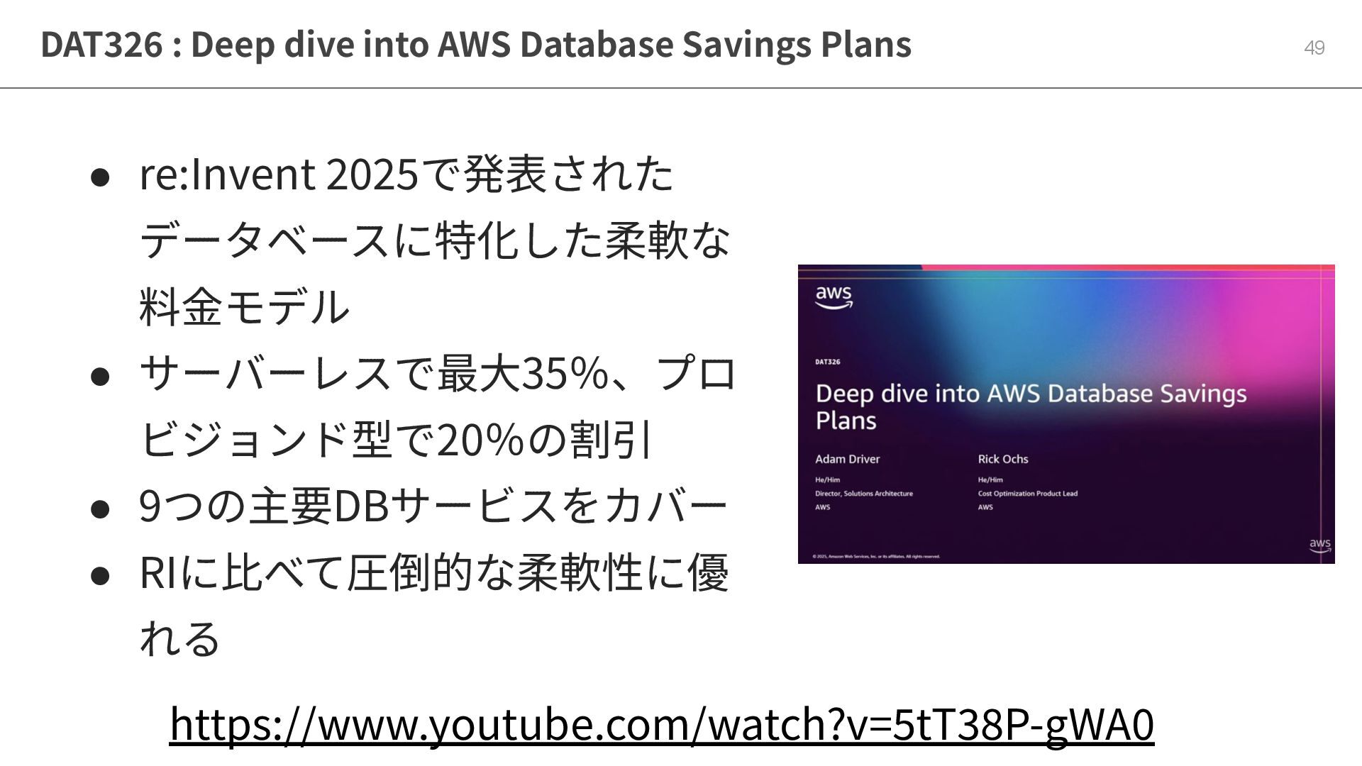 9つの主要DBサービスをカバー • RIに⽐べて圧倒的な柔軟性に優 れる DAT326 : Deep dive into AWS Database Savings Plans https://www.youtube.com/watch?v=5tT38P-gWA0
