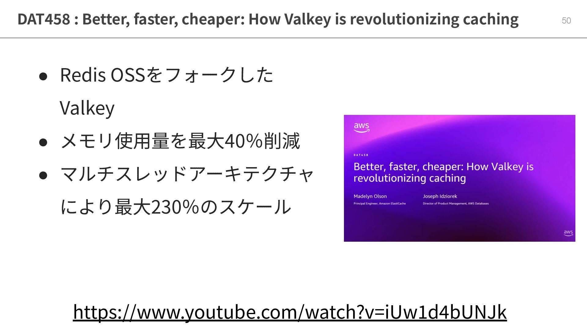 50 • Redis OSSをフォークした Valkey • メモリ使⽤量を最⼤40%削減 • マルチスレッドアーキテクチャ により最⼤230%のスケール https://www.youtube.com/watch?v=iUw1d4bUNJk