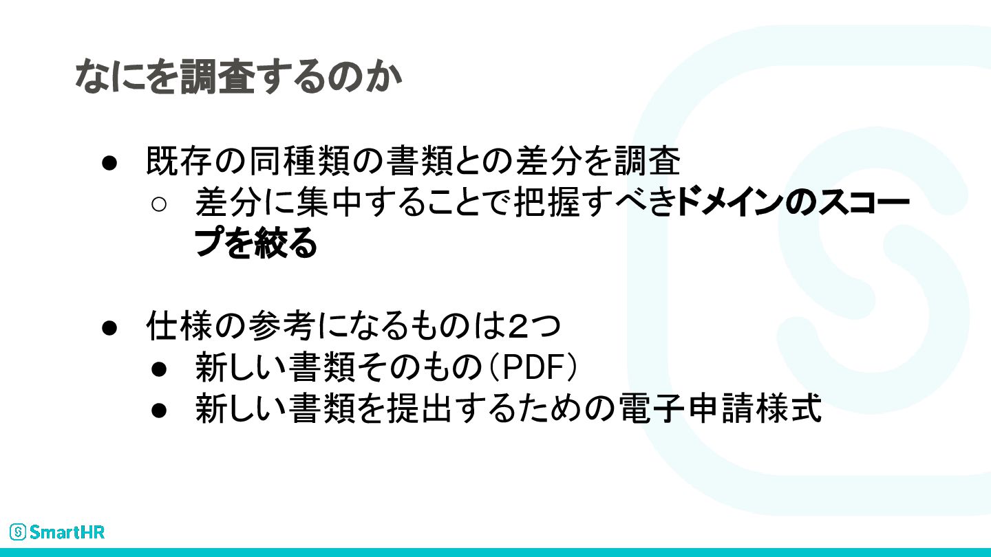 なにを調査するのか • 既存の同種類の書類との差分を調査 ◦ 差分に集中することで把握すべきドメインのスコー プを絞る • 仕様の参考になるものは2つ • 新しい書類そのもの(PDF)