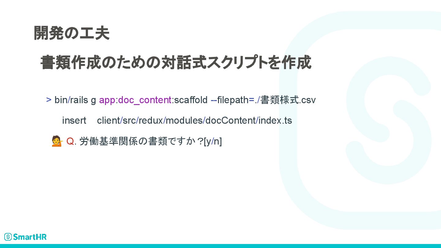 開発の工夫 書類作成のための対話式スクリプトを作成 > bin/rails g app:doc_content:scaffold --filepath=./書類様式.csv insert client/src/redux/modules/docContent/index.ts 💁