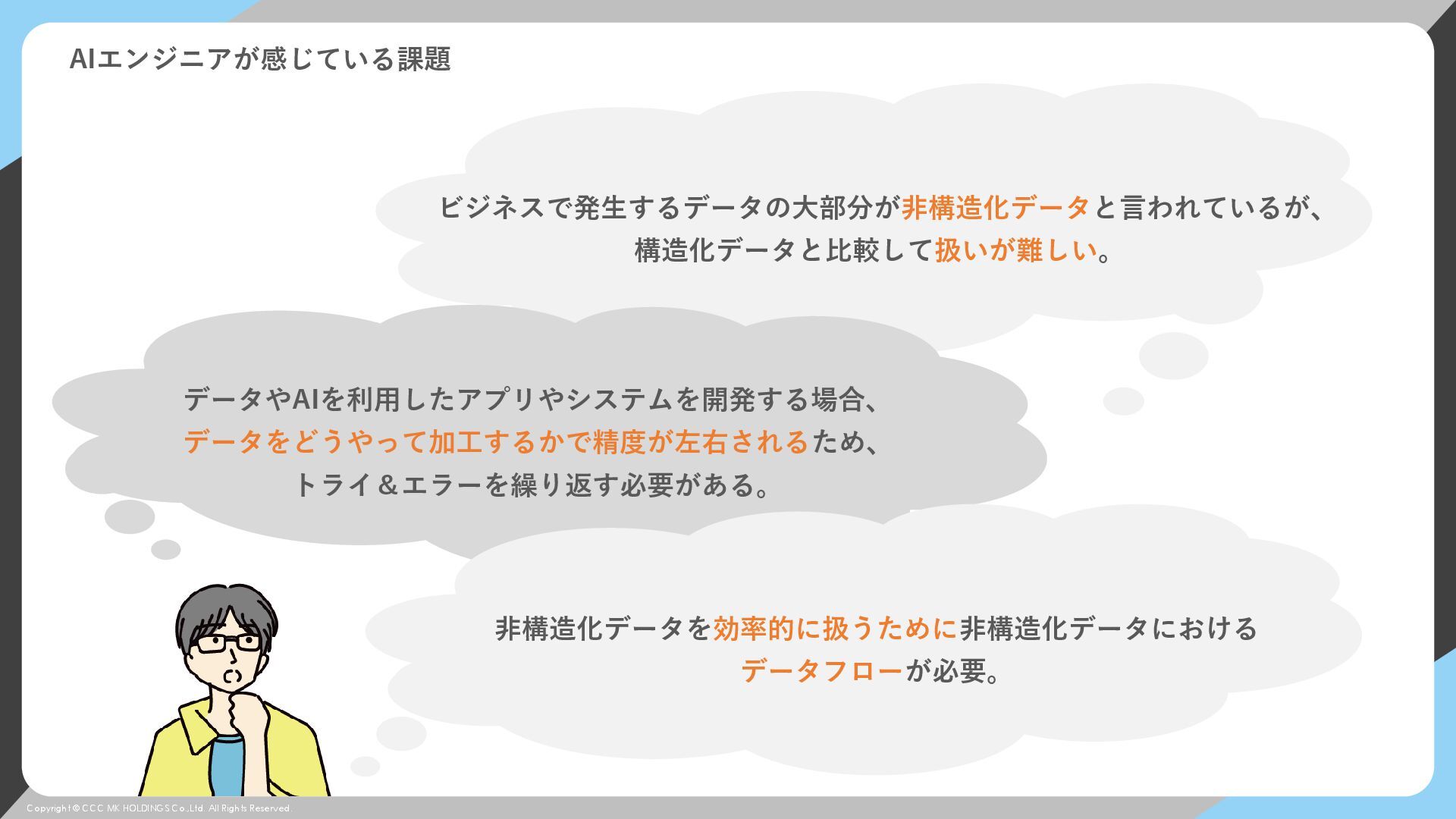 © CCC MK HOLDINGS Co.,Ltd. All Rights Reserved. AIエンジニアが感じている課題 ビジネスで発生するデータの大部分が非構造化データと言われているが、 構造化データと比較して扱いが難しい。 データやAIを利用したアプリやシステムを開発する場合、 データをどうやって加工するかで精度が左右されるため、 トライ&エラーを繰り返す必要がある。 非構造化データを効率的に扱うために非構造化データにおける データフローが必要。