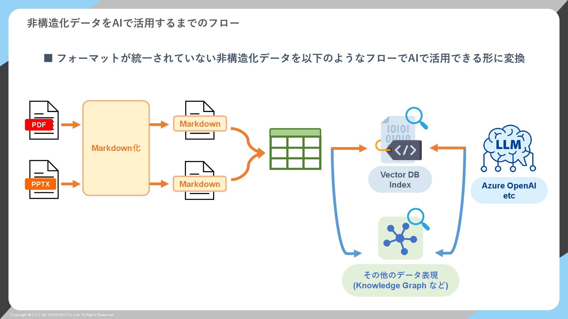 © CCC MK HOLDINGS Co.,Ltd. All Rights Reserved. 非構造化データをAIで活用するまでのフロー ▪ フォーマットが統一されていない非構造化データを以下のようなフローでAIで活用できる形に変換 Vector DB Index Markdown化 PDF PPTX Markdown Markdown Vector DB Index その他のデータ表現 (Knowledge Graph など) Azure OpenAI etc