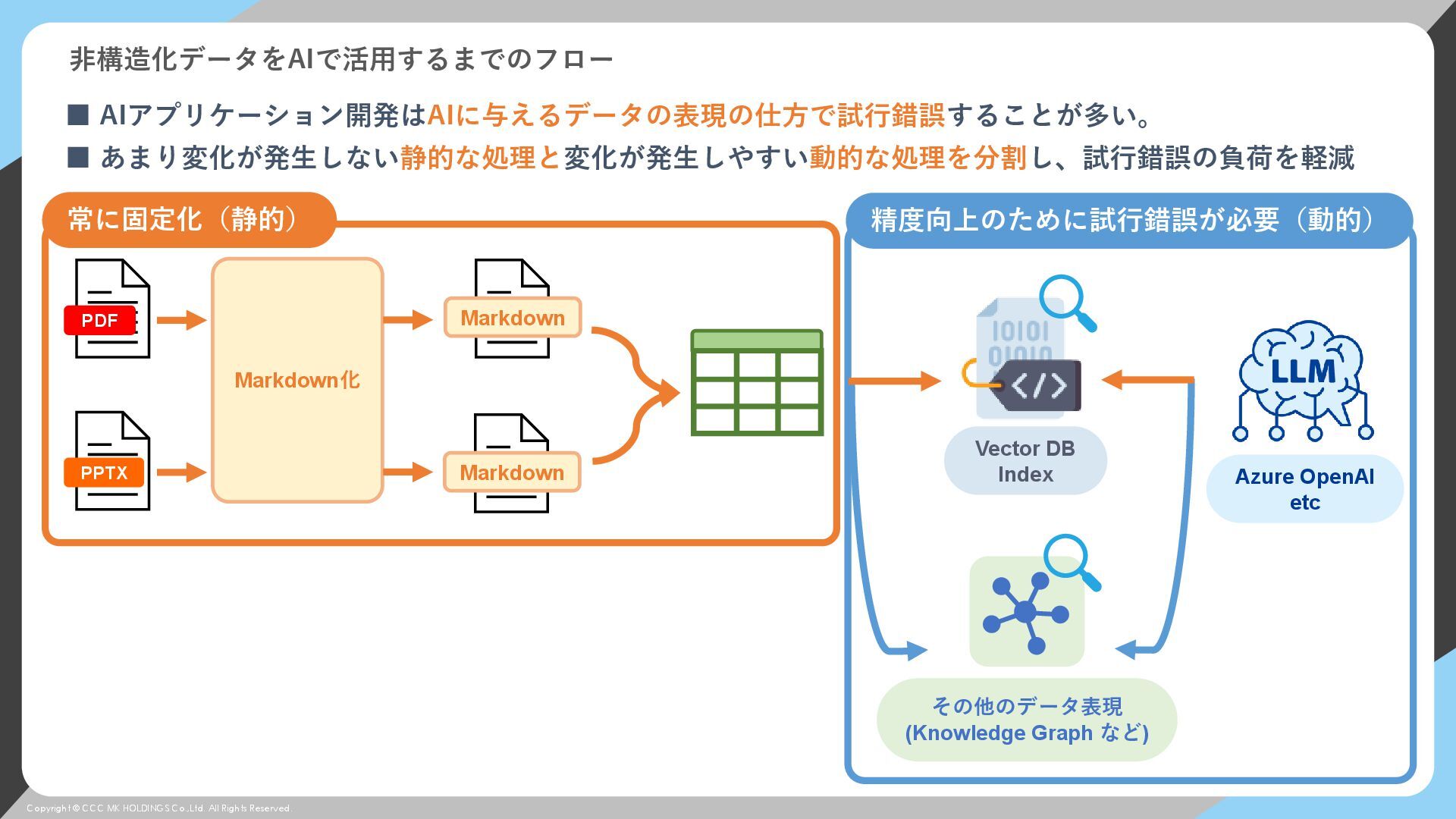 © CCC MK HOLDINGS Co.,Ltd. All Rights Reserved. 非構造化データをAIで活用するまでのフロー ▪ AIアプリケーション開発はAIに与えるデータの表現の仕方で試行錯誤することが多い。 ▪ あまり変化が発生しない静的な処理と変化が発生しやすい動的な処理を分割し、試行錯誤の負荷を軽減 常に固定化(静的) 精度向上のために試行錯誤が必要(動的) Vector DB Index Markdown化 PDF PPTX Markdown Markdown Vector DB Index その他のデータ表現 (Knowledge Graph など) Azure OpenAI etc