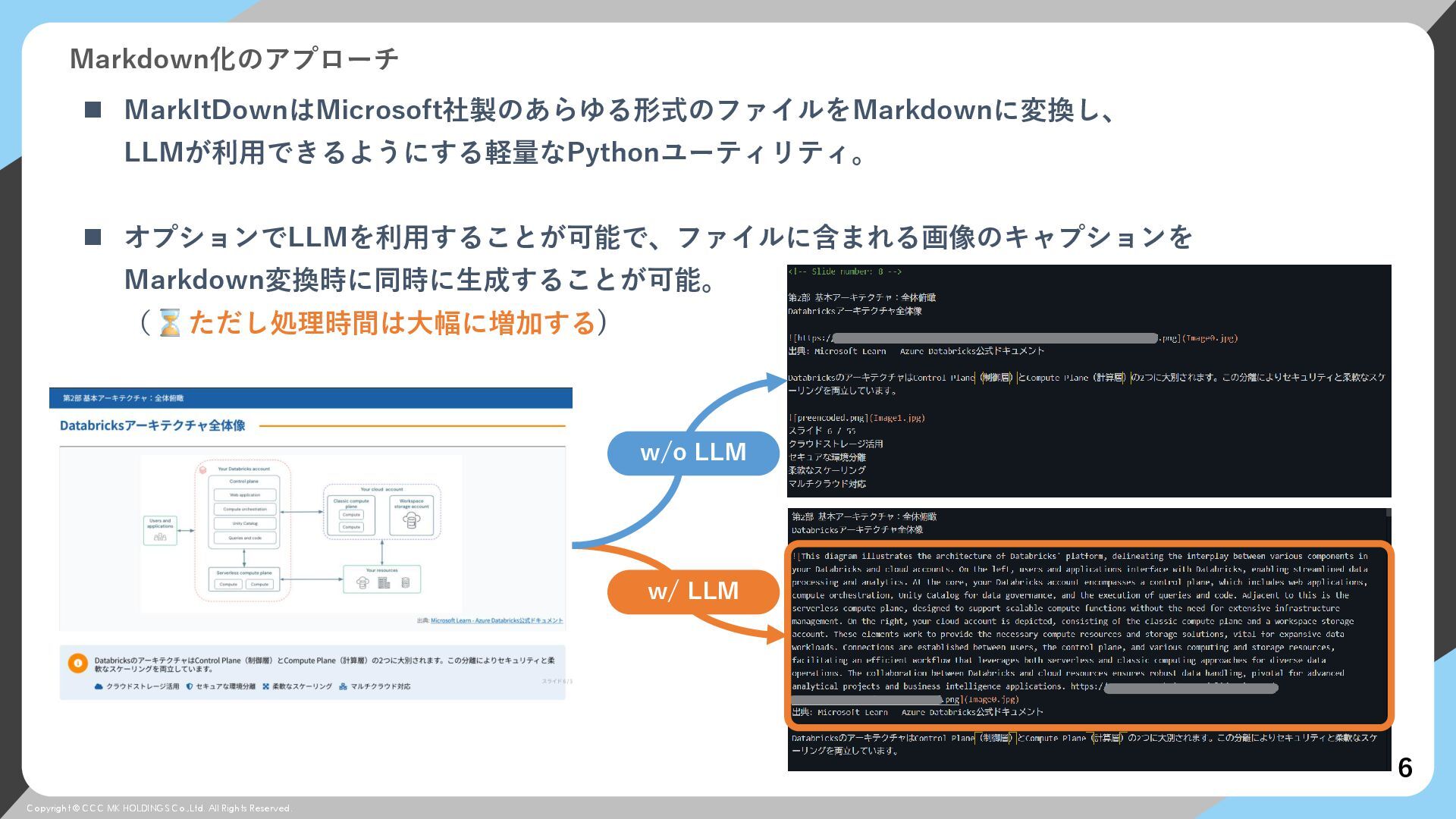 © CCC MK HOLDINGS Co.,Ltd. All Rights Reserved. Markdown化のアプローチ 6 ◼ MarkItDownはMicrosoft社製のあらゆる形式のファイルをMarkdownに変換し、 LLMが利用できるようにする軽量なPythonユーティリティ。 ◼ オプションでLLMを利用することが可能で、ファイルに含まれる画像のキャプションを Markdown変換時に同時に生成することが可能。 ( ただし処理時間は大幅に増加する) w/o LLM w/ LLM