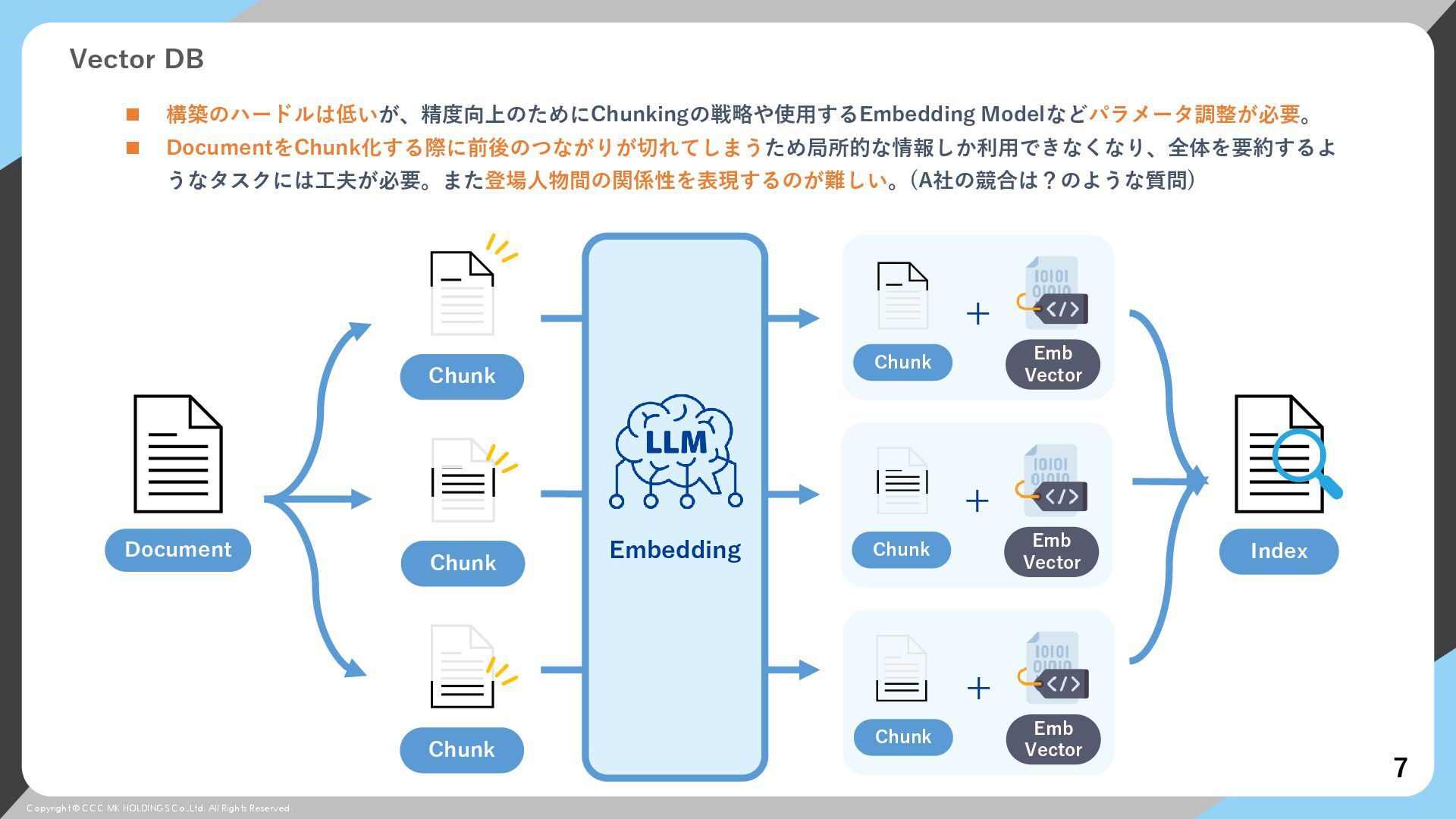 © CCC MK HOLDINGS Co.,Ltd. All Rights Reserved. Vector DB 7 ◼ 構築のハードルは低いが、精度向上のためにChunkingの戦略や使用するEmbedding Modelなどパラメータ調整が必要。 ◼ DocumentをChunk化する際に前後のつながりが切れてしまうため局所的な情報しか利用できなくなり、全体を要約するよ うなタスクには工夫が必要。また登場人物間の関係性を表現するのが難しい。(A社の競合は?のような質問) Embedding Document Chunk Chunk Chunk + Chunk Emb Vector + Chunk Emb Vector + Chunk Emb Vector Index