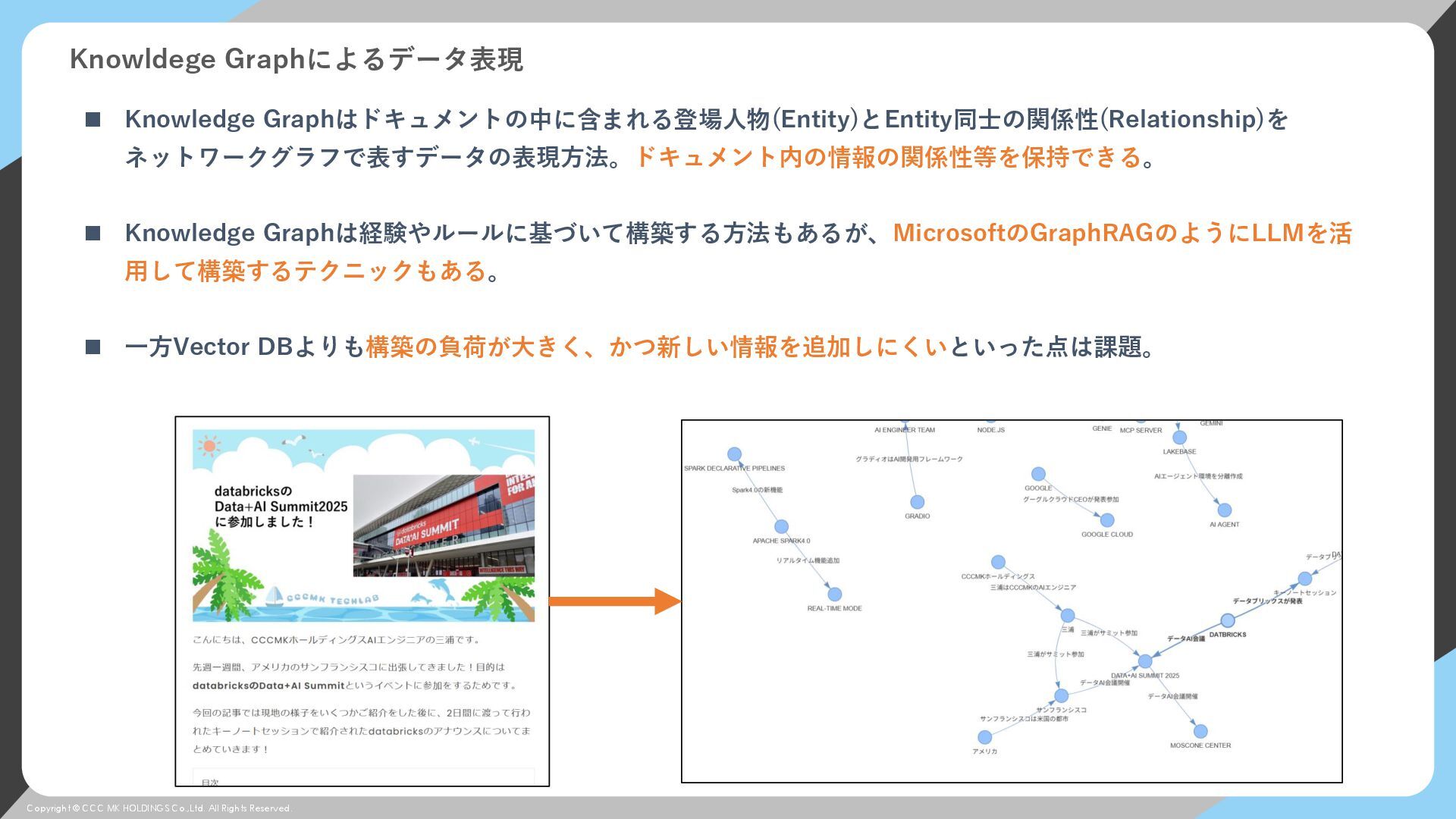 © CCC MK HOLDINGS Co.,Ltd. All Rights Reserved. Knowldege Graphによるデータ表現 ◼ Knowledge Graphはドキュメントの中に含まれる登場人物(Entity)とEntity同士の関係性(Relationship)を ネットワークグラフで表すデータの表現方法。ドキュメント内の情報の関係性等を保持できる。 ◼ Knowledge Graphは経験やルールに基づいて構築する方法もあるが、MicrosoftのGraphRAGのようにLLMを活 用して構築するテクニックもある。 ◼ 一方Vector DBよりも構築の負荷が大きく、かつ新しい情報を追加しにくいといった点は課題。