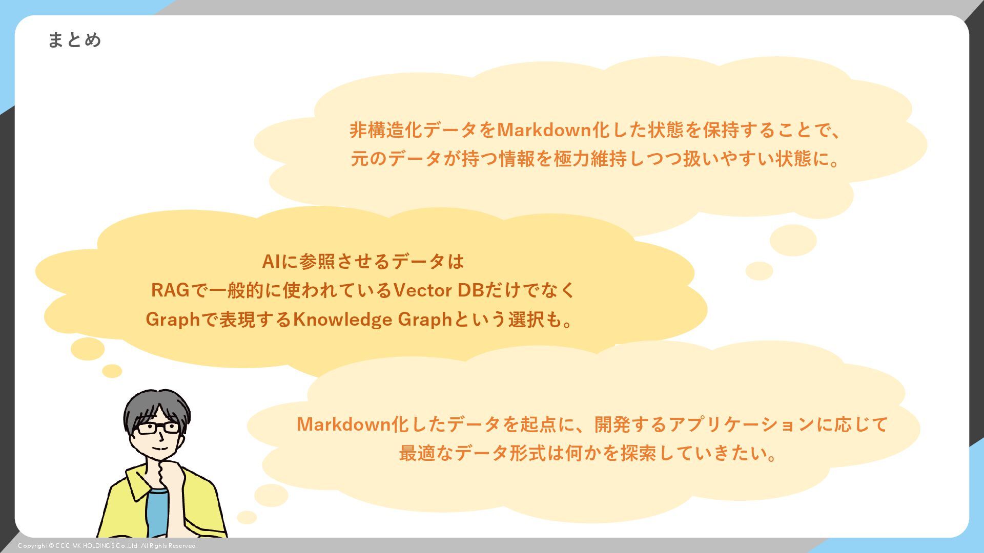 © CCC MK HOLDINGS Co.,Ltd. All Rights Reserved. まとめ 非構造化データをMarkdown化した状態を保持することで、 元のデータが持つ情報を極力維持しつつ扱いやすい状態に。 AIに参照させるデータは RAGで一般的に使われているVector DBだけでなく Graphで表現するKnowledge Graphという選択も。 Markdown化したデータを起点に、開発するアプリケーションに応じて 最適なデータ形式は何かを探索していきたい。