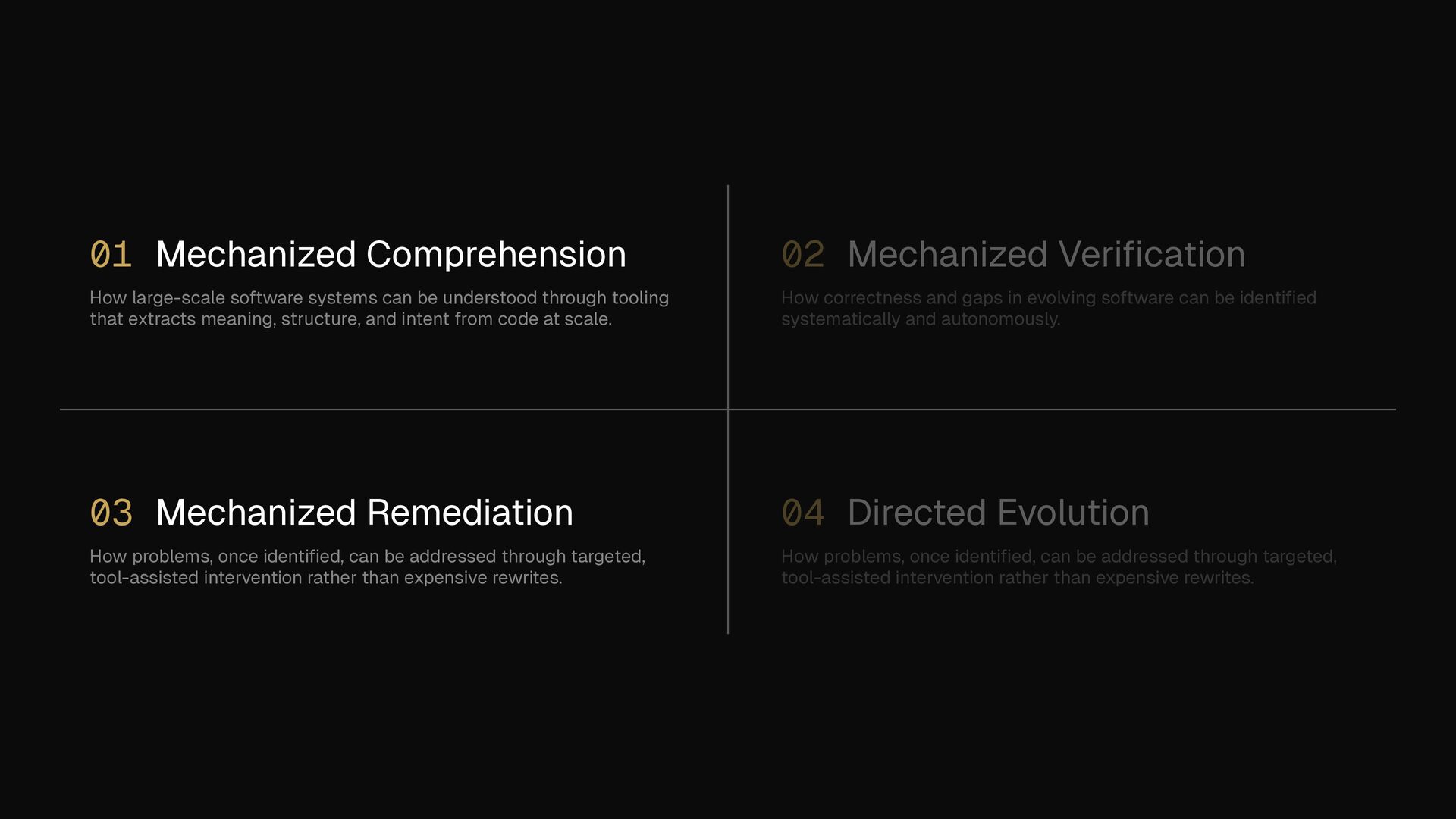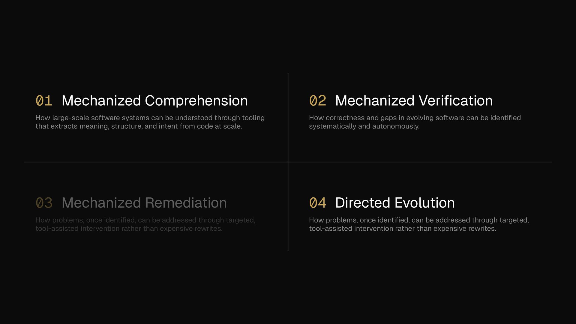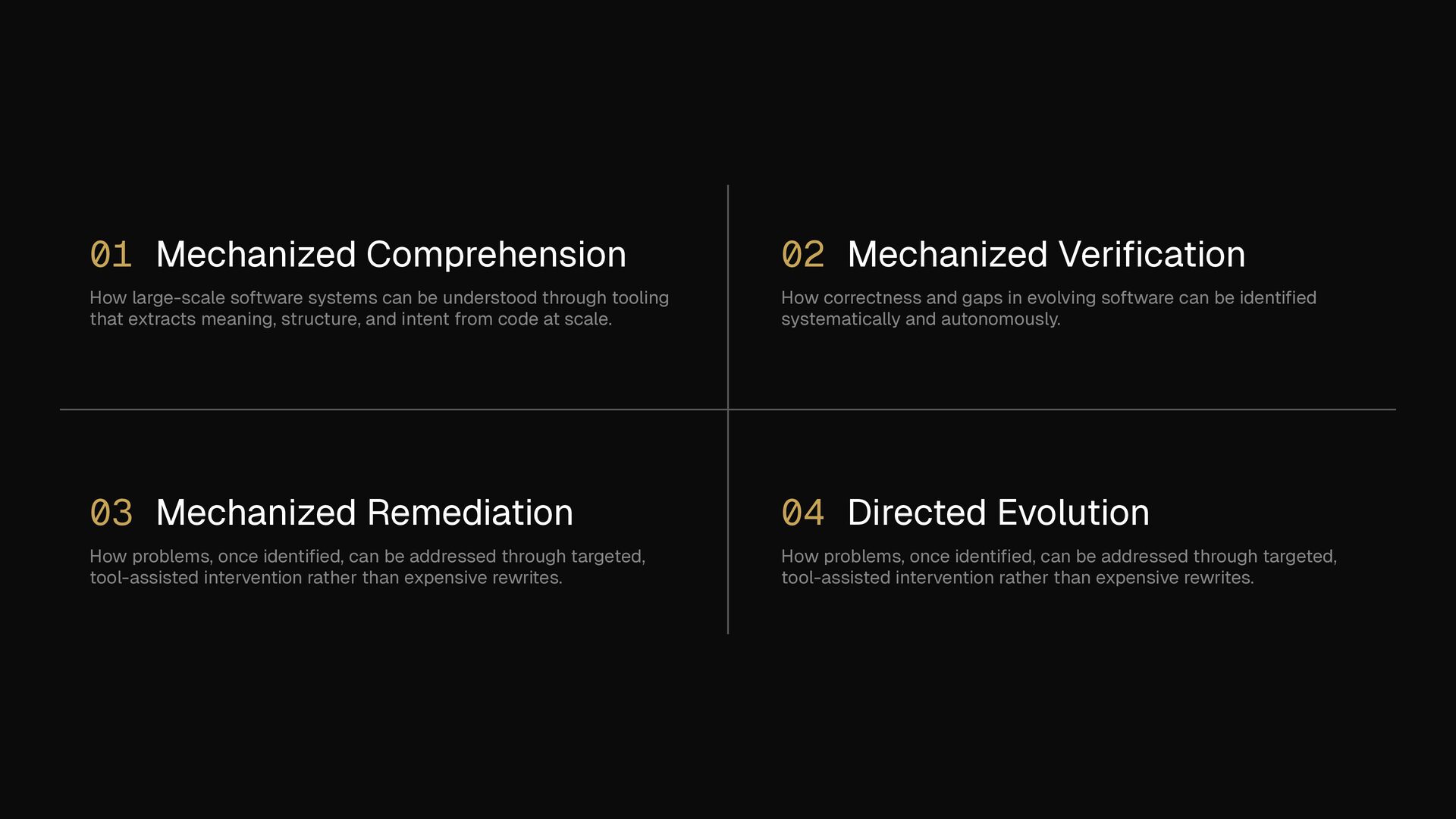through tooling that extracts meaning, structure, and intent from code at scale. 02 Mechanized Veri fi cation How correctness and gaps in evolving software can be identi fi ed systematically and autonomously. 03 Mechanized Remediation How problems, once identi fi ed, can be addressed through targeted, tool-assisted intervention rather than expensive rewrites. 04 Directed Evolution How problems, once identi fi ed, can be addressed through targeted, tool-assisted intervention rather than expensive rewrites.