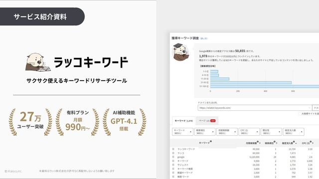 キーワードリサーチツール「ラッコキーワード」のサービス紹介資料です。 SEO・Webマーケティング・商品開発・サービス開発・顧客開拓・コンテンツ作成など様々な場面で活躍します。