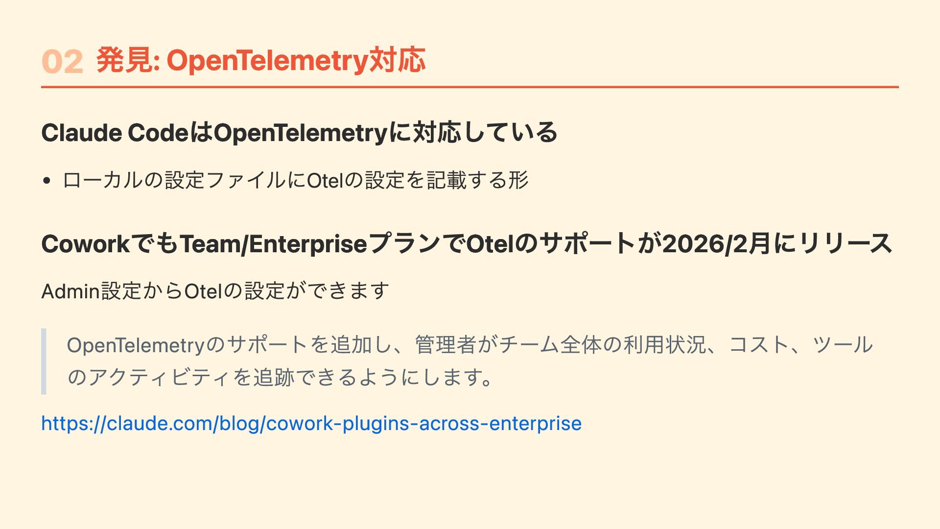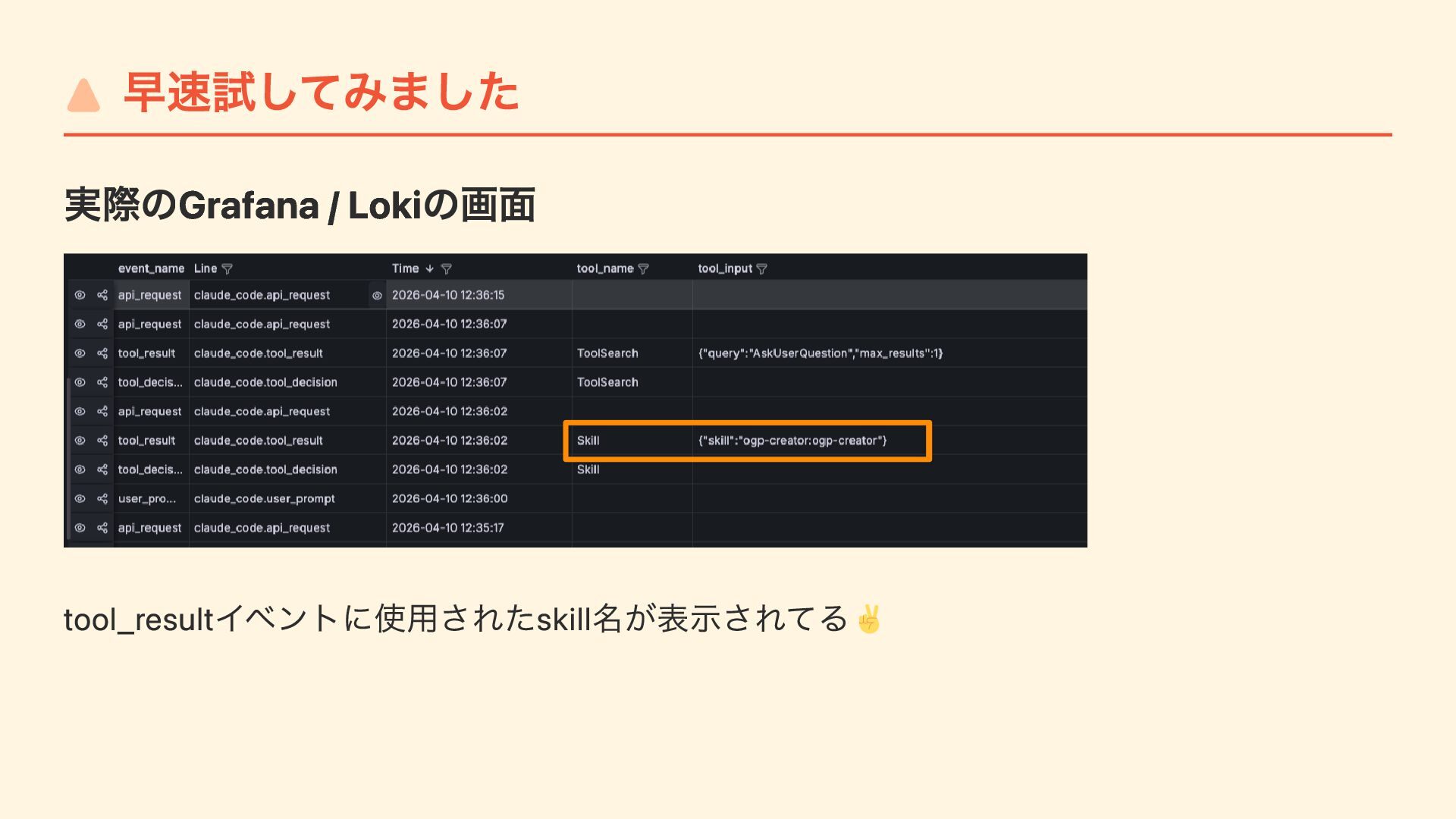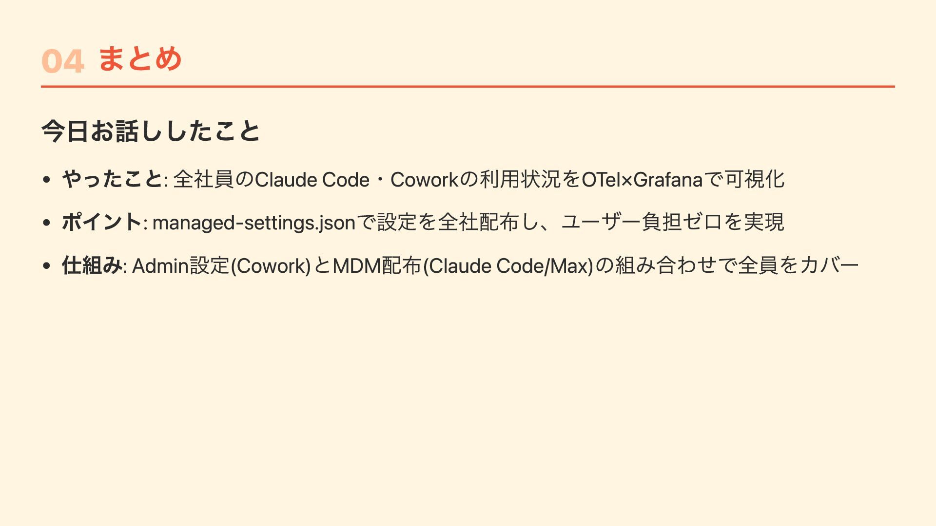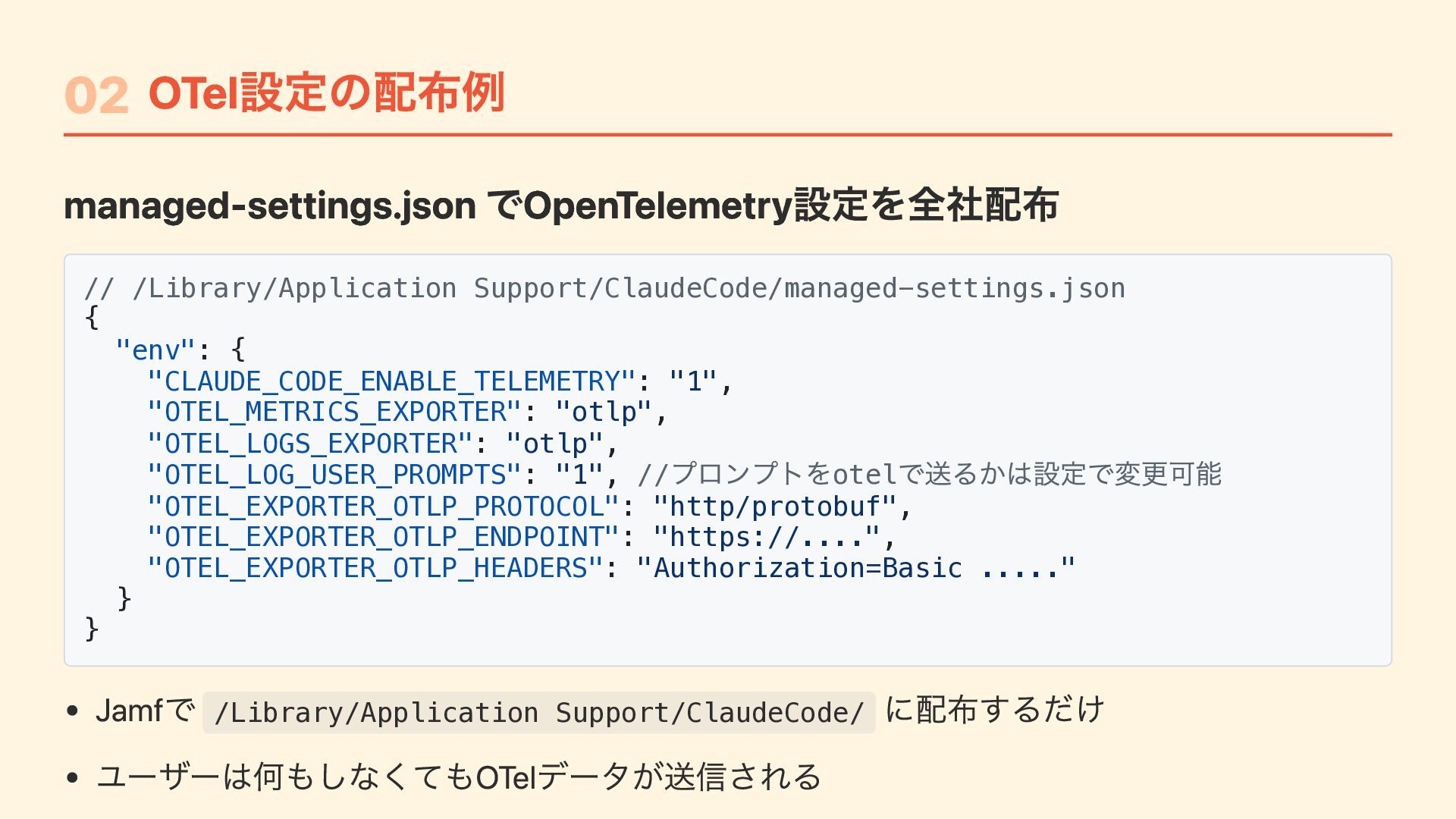 "CLAUDE_CODE_ENABLE_TELEMETRY": "1", "OTEL_METRICS_EXPORTER": "otlp", "OTEL_LOGS_EXPORTER": "otlp", "OTEL_LOG_USER_PROMPTS": "1", // プロンプトをotel で送るかは設定で変更可能 "OTEL_EXPORTER_OTLP_PROTOCOL": "http/protobuf", "OTEL_EXPORTER_OTLP_ENDPOINT": "https://....", "OTEL_EXPORTER_OTLP_HEADERS": "Authorization=Basic ....." } } Jamfで /Library/Application Support/ClaudeCode/ に配布するだけ ユーザーは何もしなくてもOTelデータが送信される