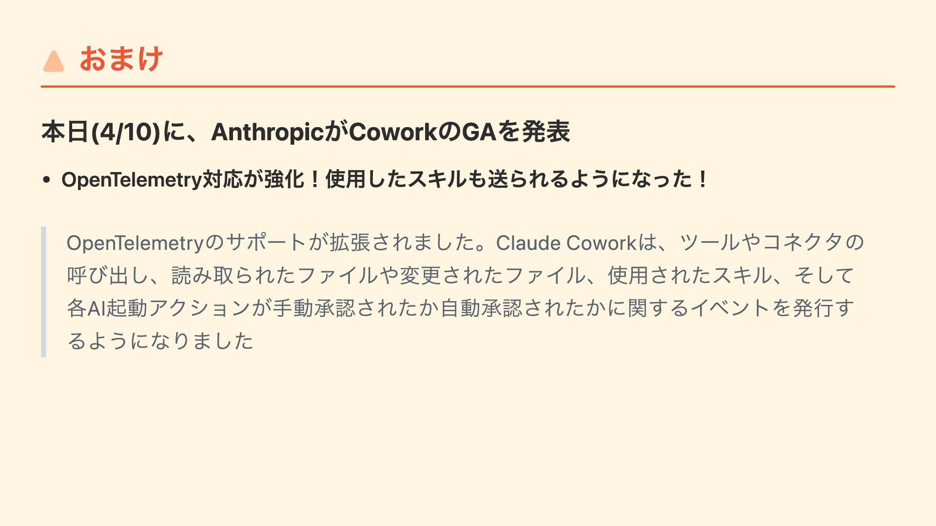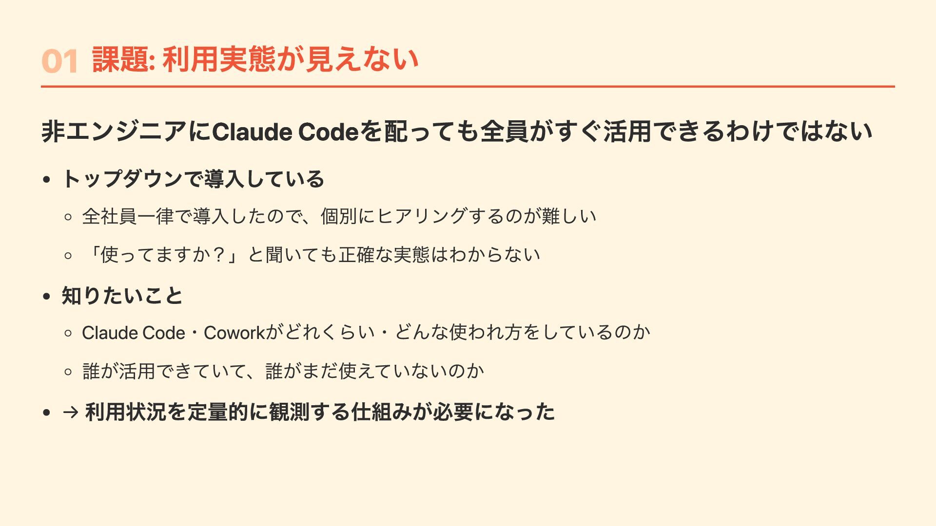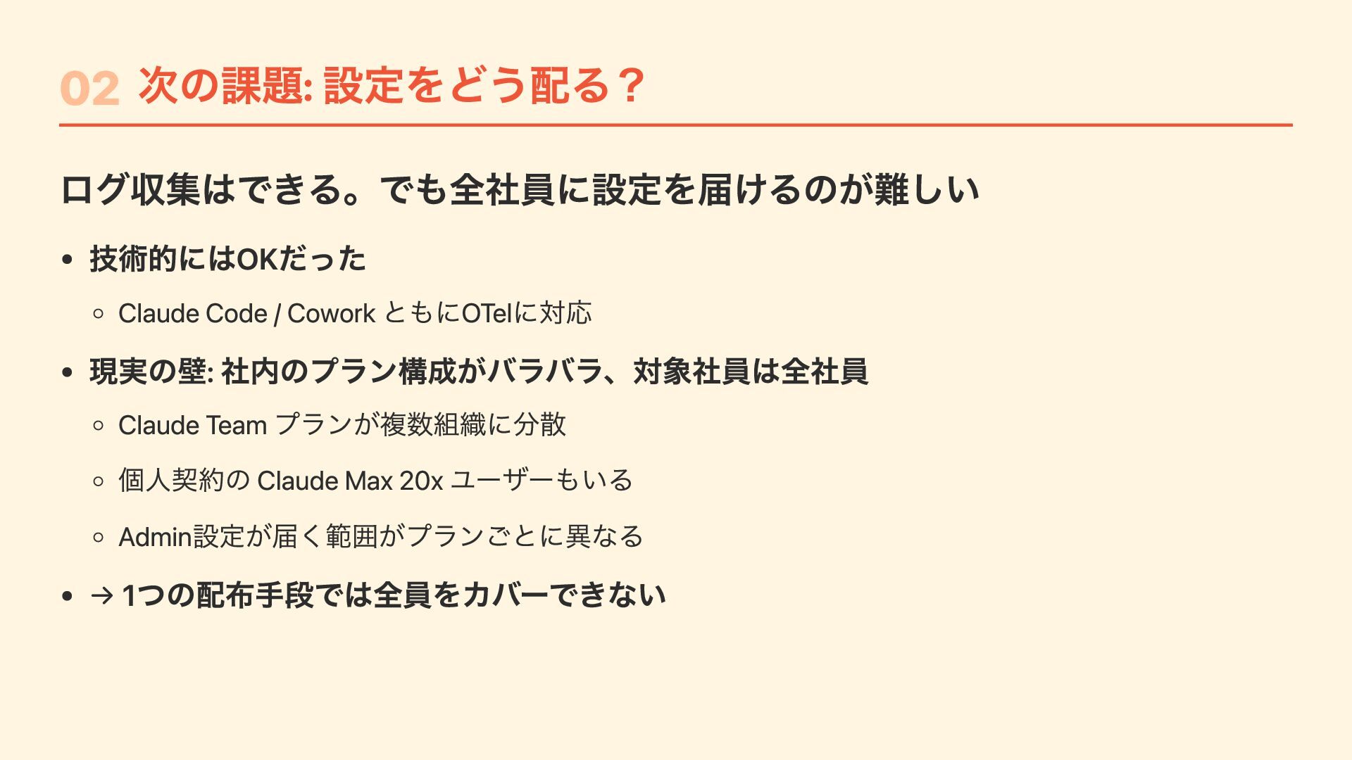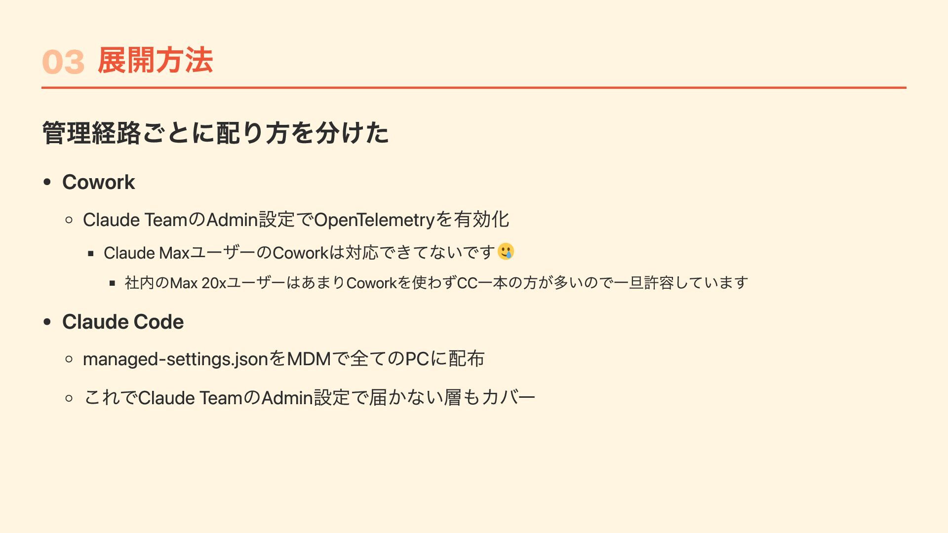 "CLAUDE_CODE_ENABLE_TELEMETRY": "1", "OTEL_METRICS_EXPORTER": "otlp", "OTEL_LOGS_EXPORTER": "otlp", "OTEL_LOG_USER_PROMPTS": "1", // プロンプトをotel で送るかは設定で変更可能 "OTEL_EXPORTER_OTLP_PROTOCOL": "http/protobuf", "OTEL_EXPORTER_OTLP_ENDPOINT": "https://....", "OTEL_EXPORTER_OTLP_HEADERS": "Authorization=Basic ....." } } Jamfで /Library/Application Support/ClaudeCode/ に配布するだけ ユーザーは何もしなくてもOTelデータが送信される