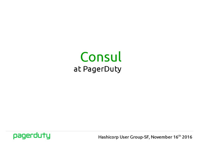entire infrastructure • Different features used in different parts of the system • Almost 12-15% of the current infra is using consul in one or other way (mostly around containerized workload) • Incremental deployment across mission critical services Hashicorp User Group-SF, November 16th 2016