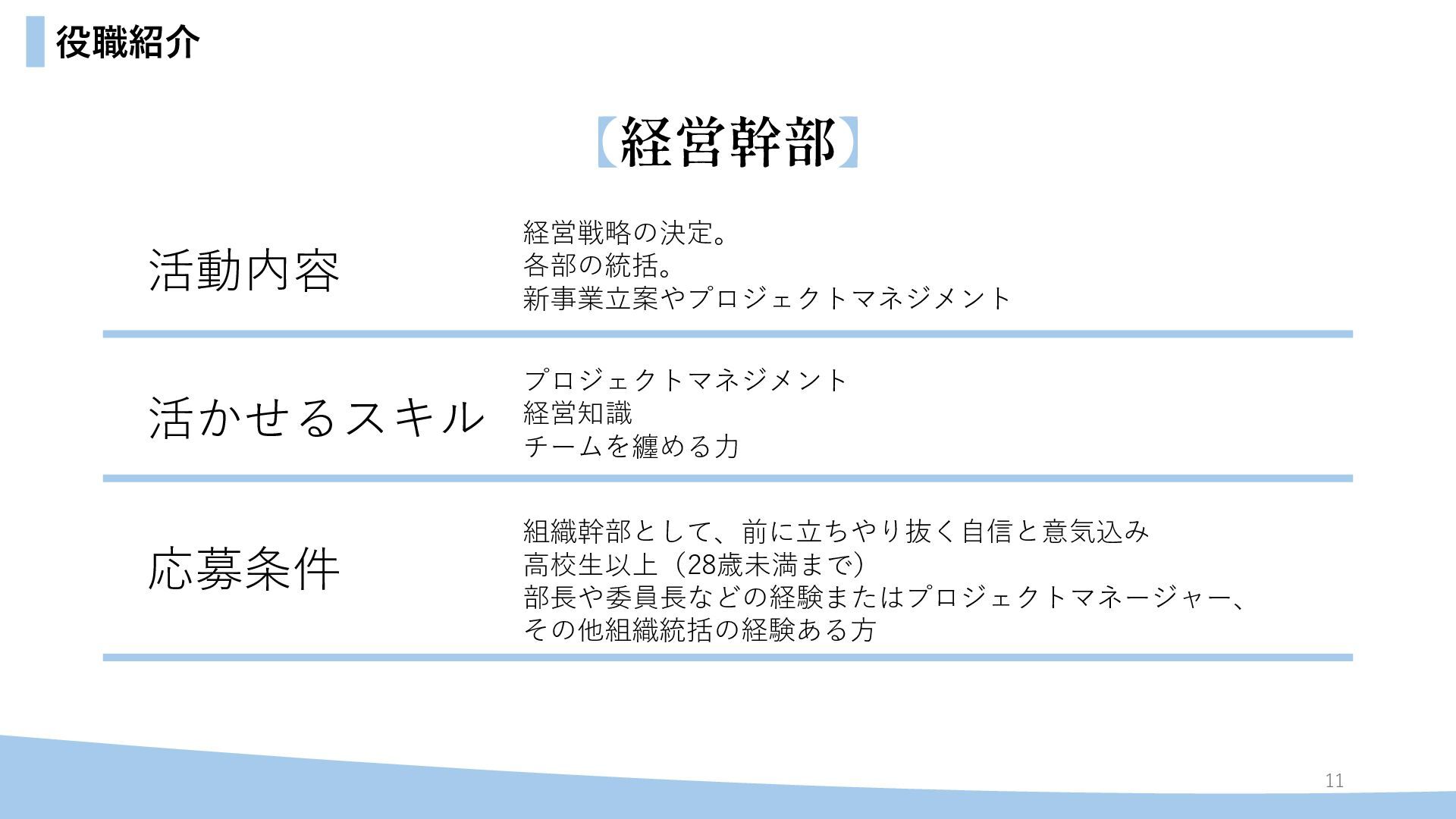 _________ 役職紹介 【経営幹部】 活動内容 経営戦略の決定。 各部の統括。 新事業立案やプロジェクトマネジメント 活かせるスキル プロジェクトマネジメント 経営知識