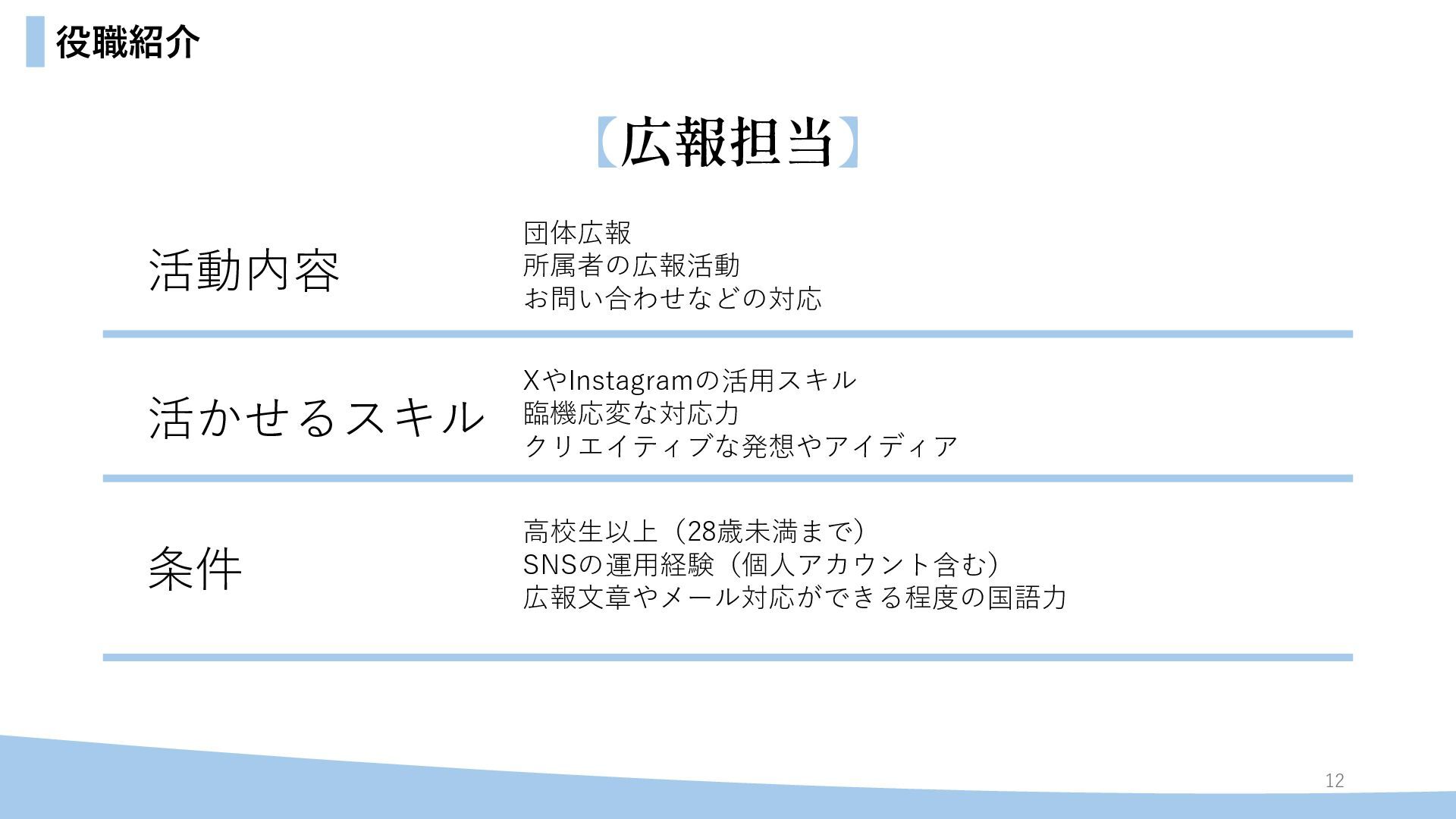 _________ 役職紹介 【広報担当】 活動内容 団体広報 所属者の広報活動 お問い合わせなどの対応 活かせるスキル XやInstagramの活用スキル 臨機応変な対応力