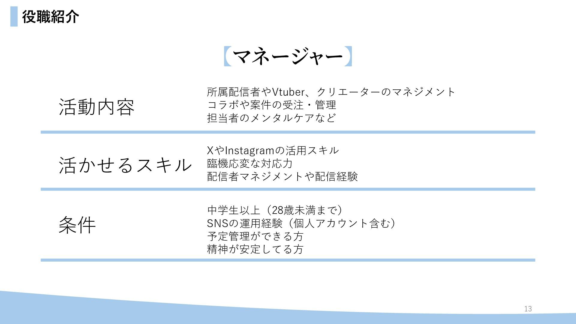 _________ 役職紹介 【マネージャー】 活動内容 所属配信者やVtuber、クリエーターのマネジメント コラボや案件の受注・管理 担当者のメンタルケアなど 活かせるスキル XやInstagramの活用スキル 臨機応変な対応力
