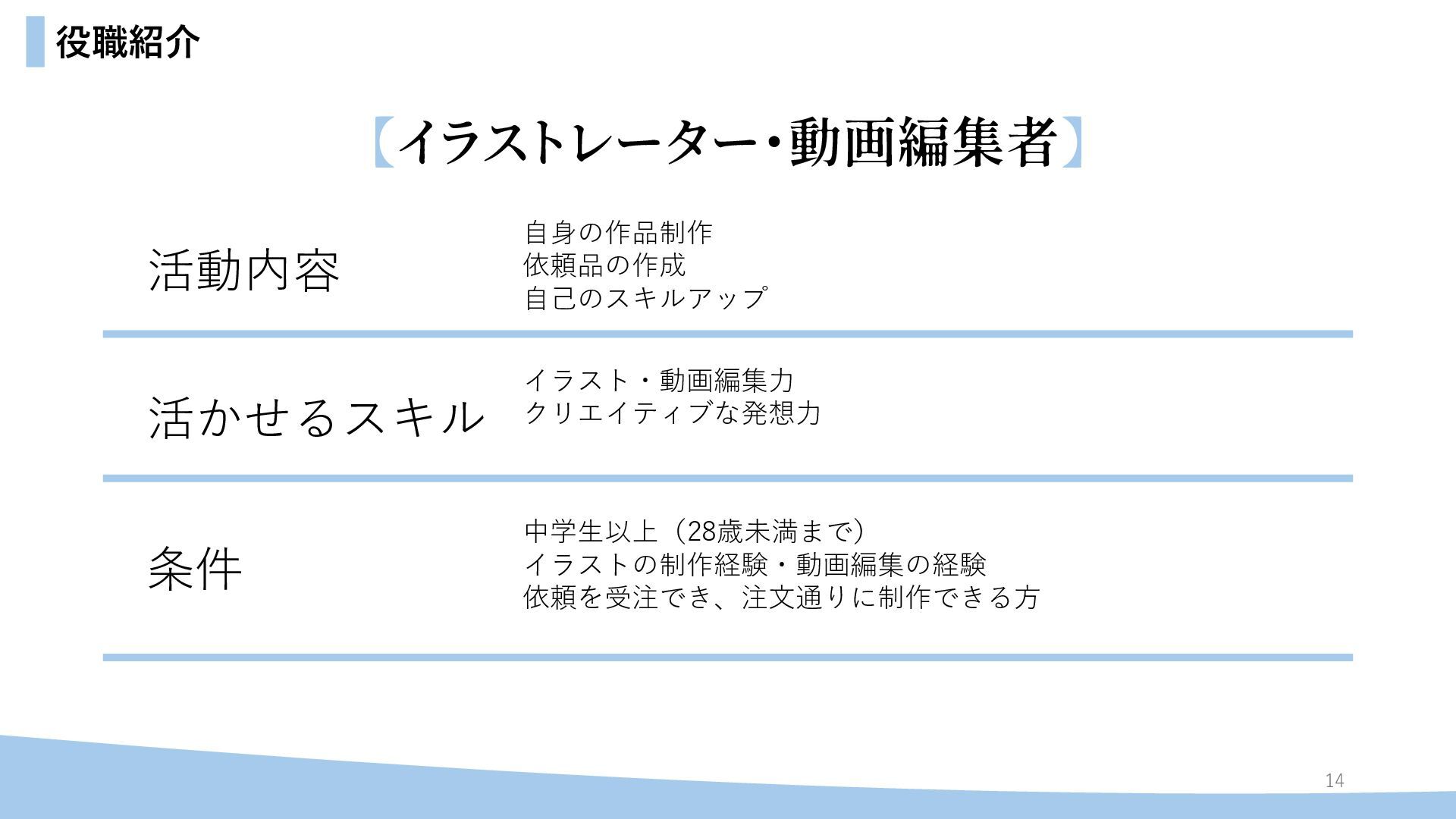 _________ 役職紹介 【イラストレーター・動画編集者】 活動内容 自身の作品制作 依頼品の作成 自己のスキルアップ 活かせるスキル イラスト・動画編集力 クリエイティブな発想力