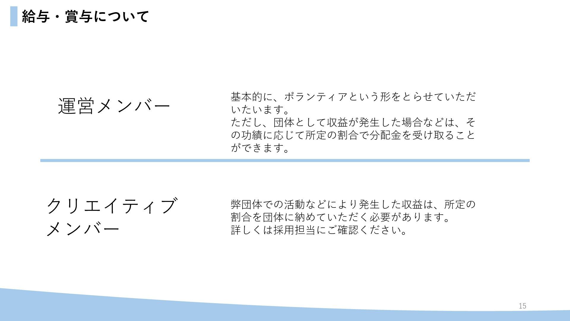 _________ 給与・賞与について 15 運営メンバー クリエイティブ メンバー 基本的に、ボランティアという形をとらせていただ いたいます。 ただし、団体として収益が発生した場合などは、そ の功績に応じて所定の割合で分配金を受け取ること