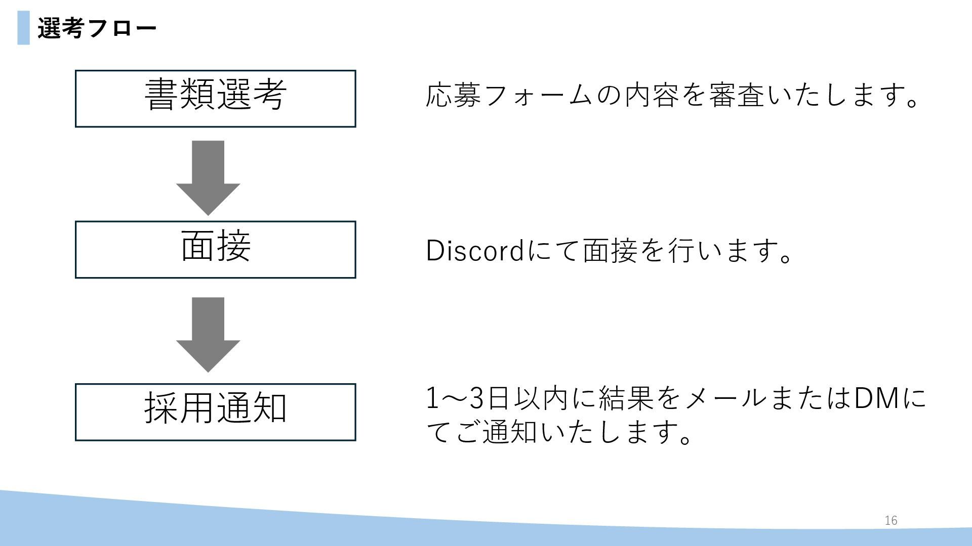 _________ 選考フロー 書類選考 面接 採用通知 応募フォームの内容を審査いたします。 Discordにて面接を行います。 1~3日以内に結果をメールまたはDMに てご通知いたします。 16