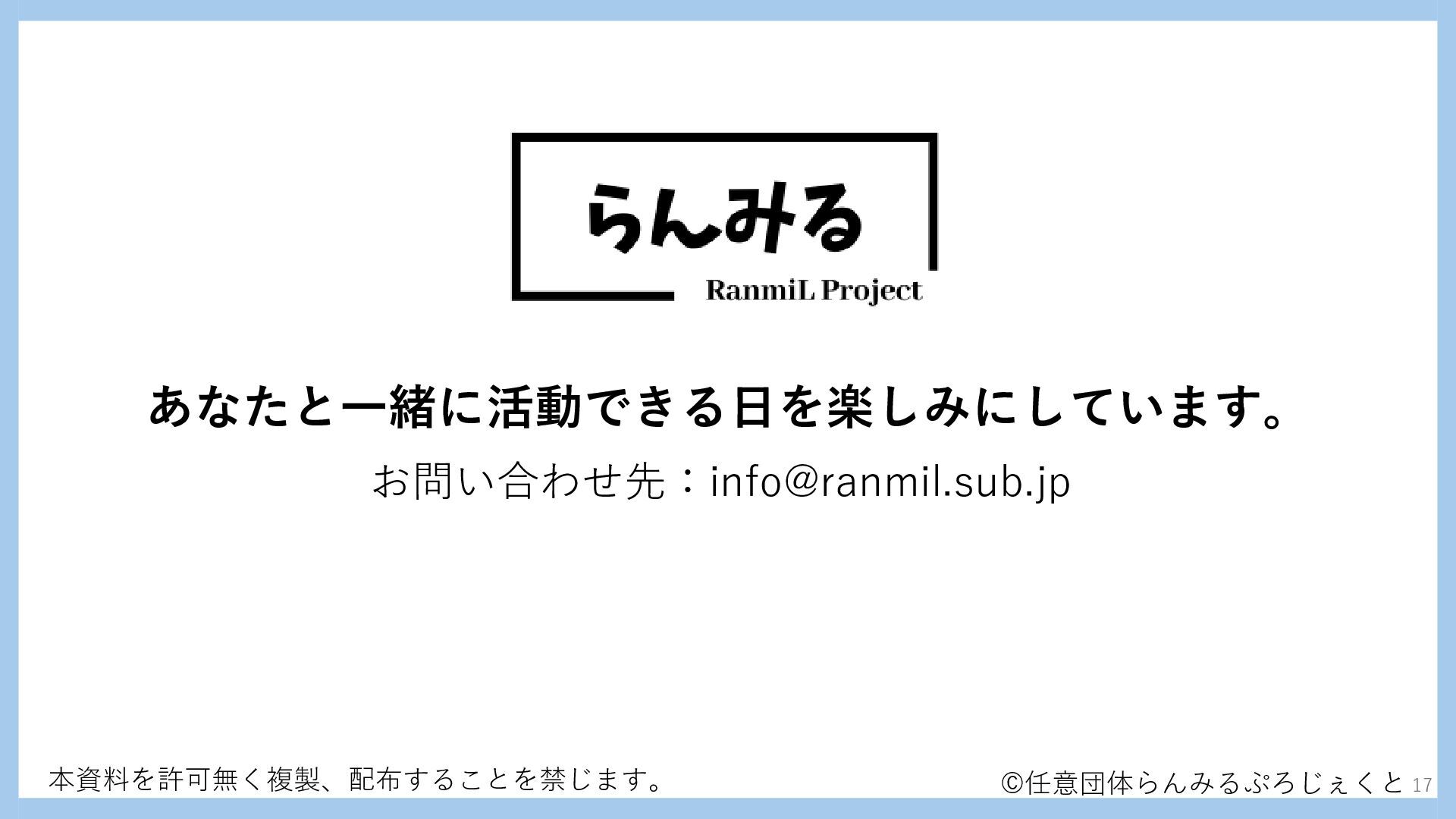 あなたと一緒に活動できる日を楽しみにしています。 本資料を許可無く複製、配布することを禁じます。 ©任意団体らんみるぷろじぇくと お問い合わせ先: