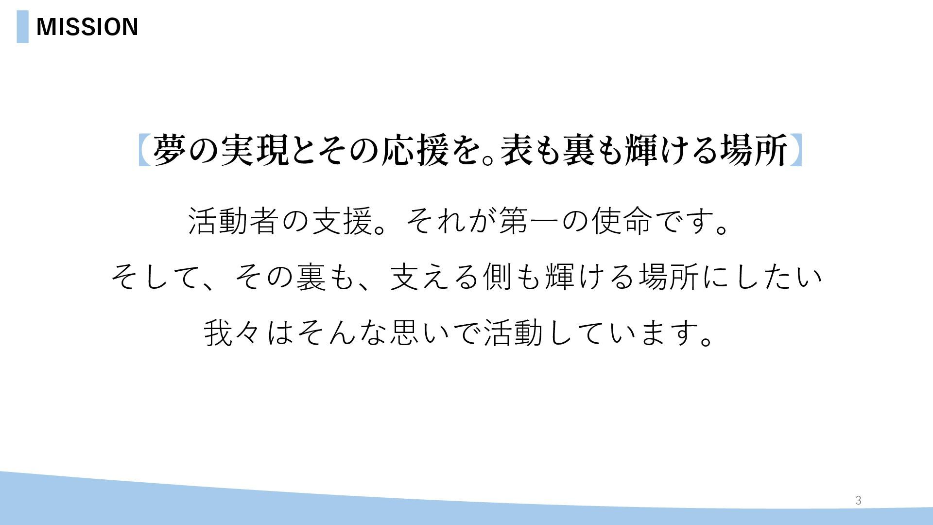 _________ MISSION 【夢の実現とその応援を。表も裏も輝ける場所】 活動者の支援。それが第一の使命です。 そして、その裏も、支える側も輝ける場所にしたい 我々はそんな思いで活動しています。 3