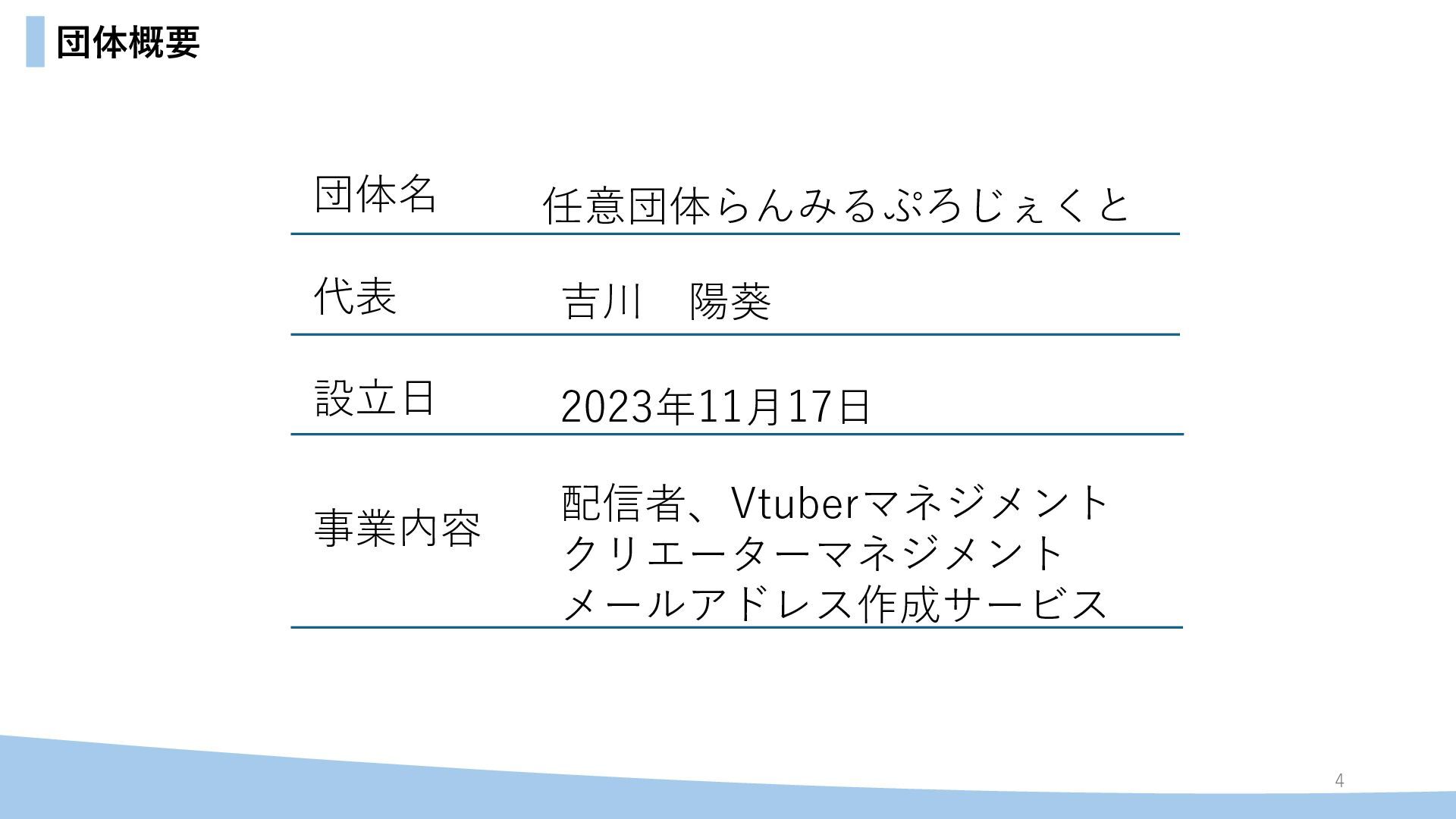 _________ 団体概要 団体名 代表 設立日 事業内容 任意団体らんみるぷろじぇくと 吉川 陽葵 2023年11月17日