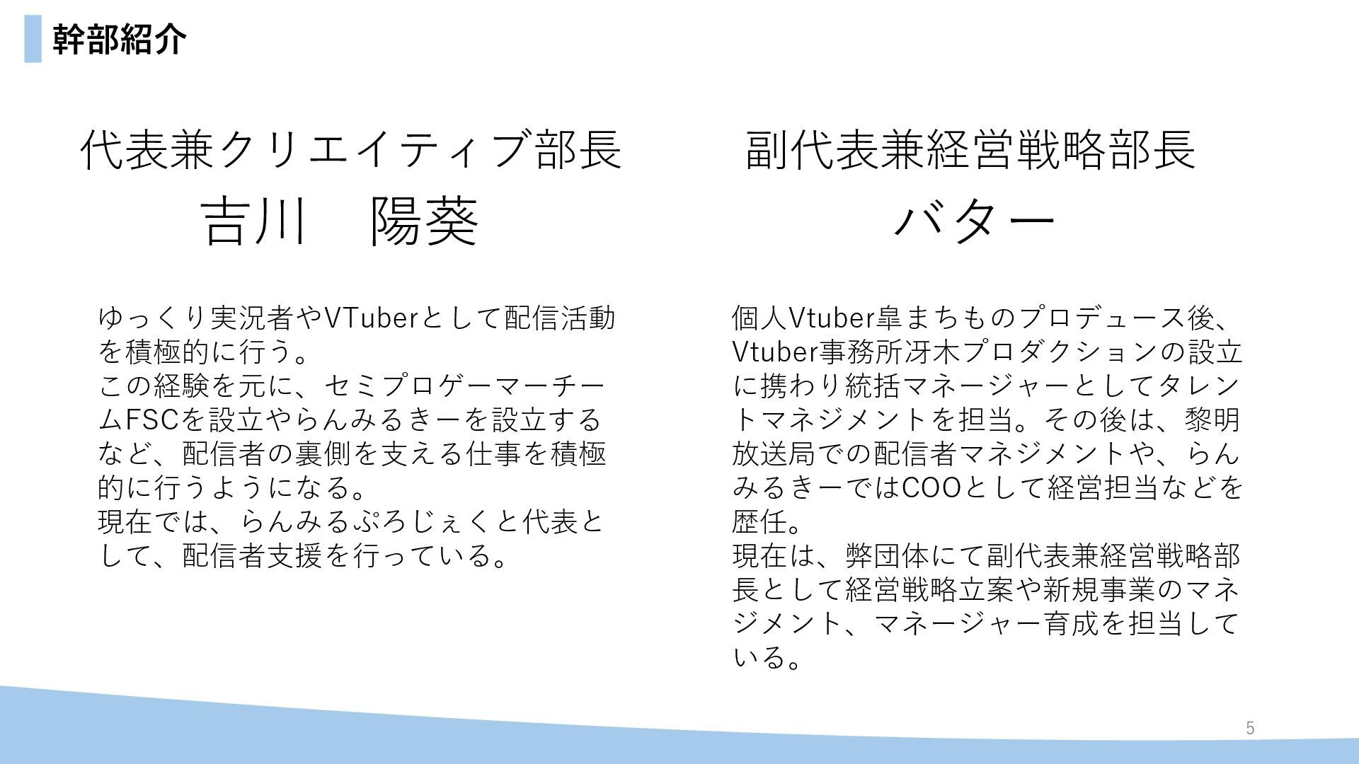 ムFSCを設立やらんみるきーを設立する など、配信者の裏側を支える仕事を積極 的に行うようになる。 現在では、らんみるぷろじぇくと代表と して、配信者支援を行っている。 個人Vtuber皐まちものプロデュース後、 Vtuber事務所冴木プロダクションの設立 に携わり統括マネージャーとしてタレン トマネジメントを担当。その後は、黎明 放送局での配信者マネジメントや、らん みるきーではCOOとして経営担当などを 歴任。 現在は、弊団体にて副代表兼経営戦略部 長として経営戦略立案や新規事業のマネ ジメント、マネージャー育成を担当して いる。 5
