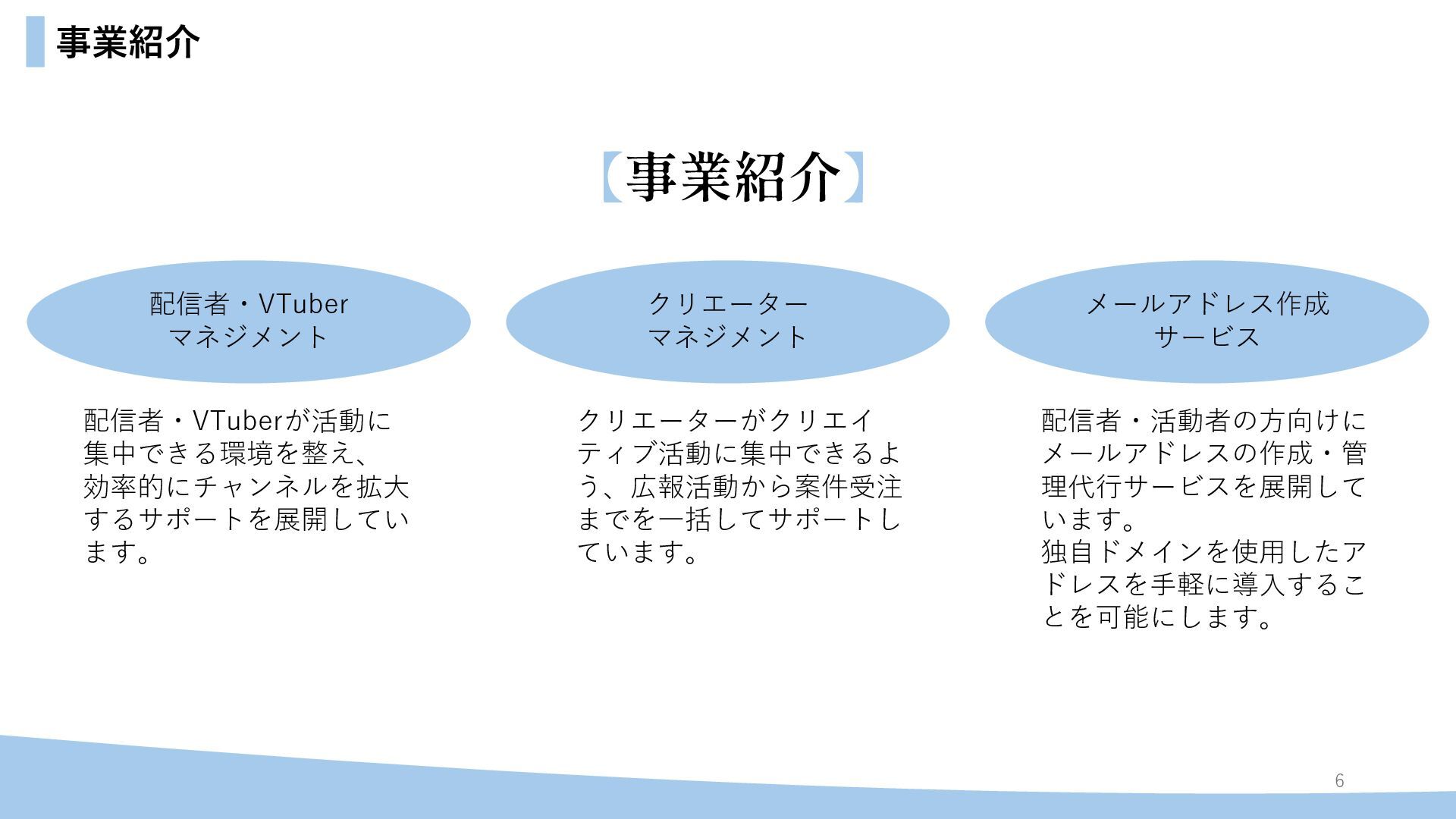 集中できる環境を整え、 効率的にチャンネルを拡大 するサポートを展開してい ます。 クリエーターがクリエイ ティブ活動に集中できるよ う、広報活動から案件受注 までを一括してサポートし ています。 配信者・活動者の方向けに メールアドレスの作成・管 理代行サービスを展開して います。 独自ドメインを使用したア ドレスを手軽に導入するこ とを可能にします。 6