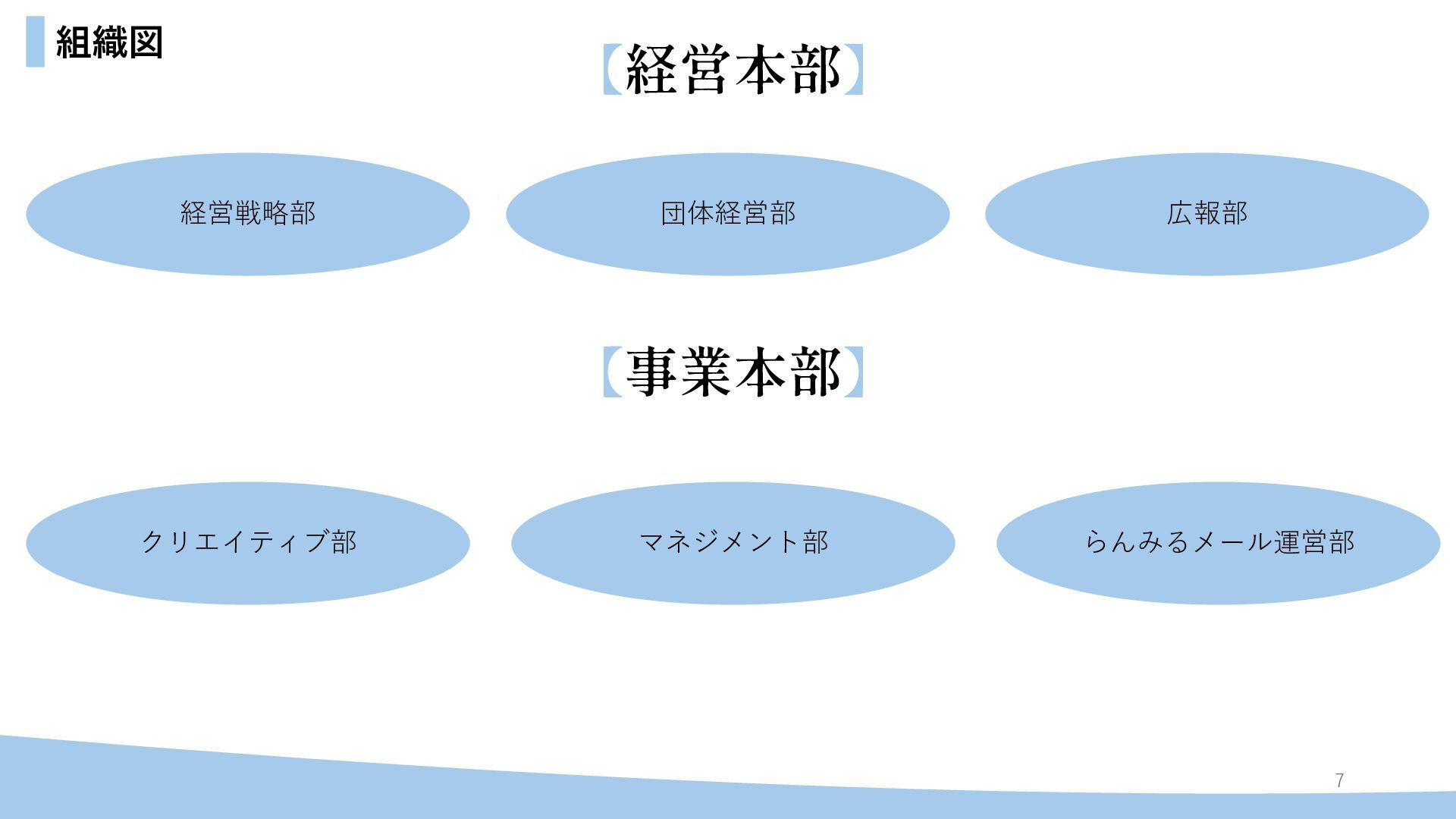 _________ 組織図 【経営本部】 団体経営部 経営戦略部 広報部 【事業本部】 クリエイティブ部 マネジメント部 らんみるメール運営部
