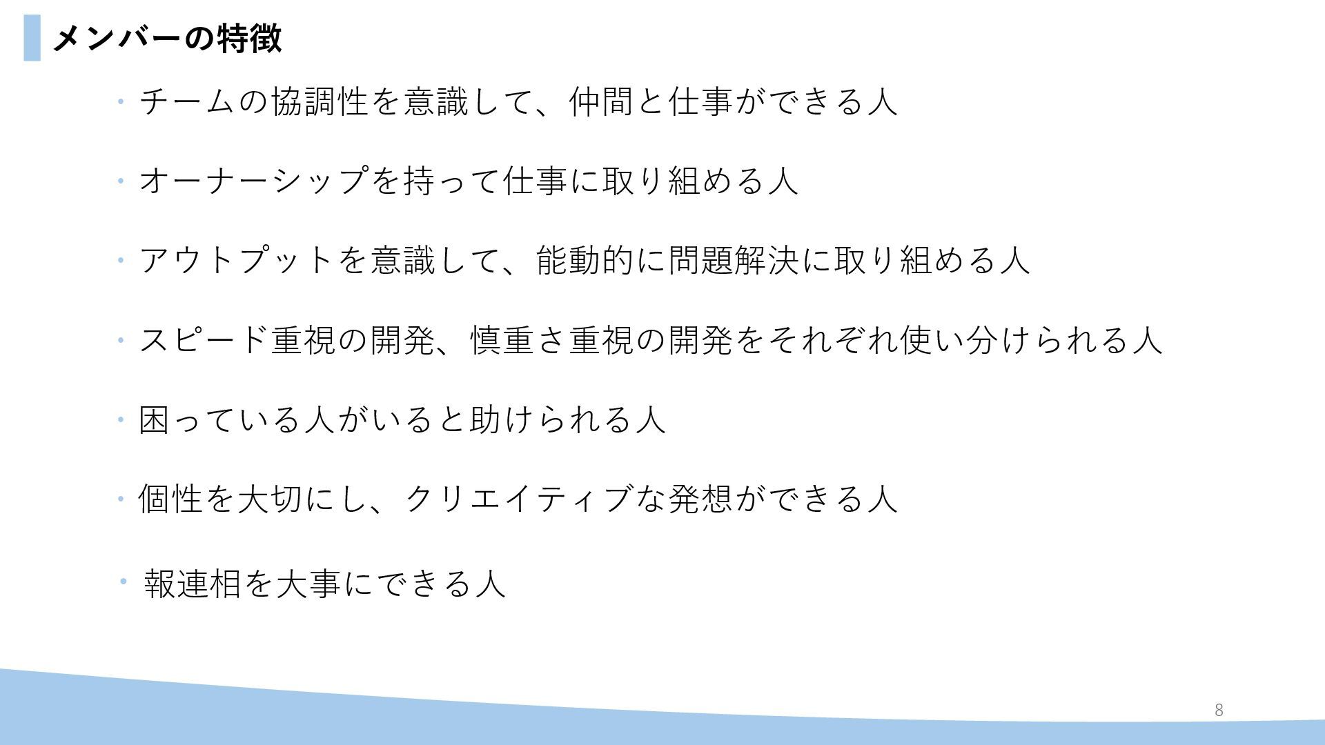 _________ メンバーの特徴 ・チームの協調性を意識して、仲間と仕事ができる人 ・オーナーシップを持って仕事に取り組める人 ・アウトプットを意識して、能動的に問題解決に取り組める人 ・スピード重視の開発、慎重さ重視の開発をそれぞれ使い分けられる人 ・困っている人がいると助けられる人 ・個性を大切にし、クリエイティブな発想ができる人 ・報連相を大事にできる人 8