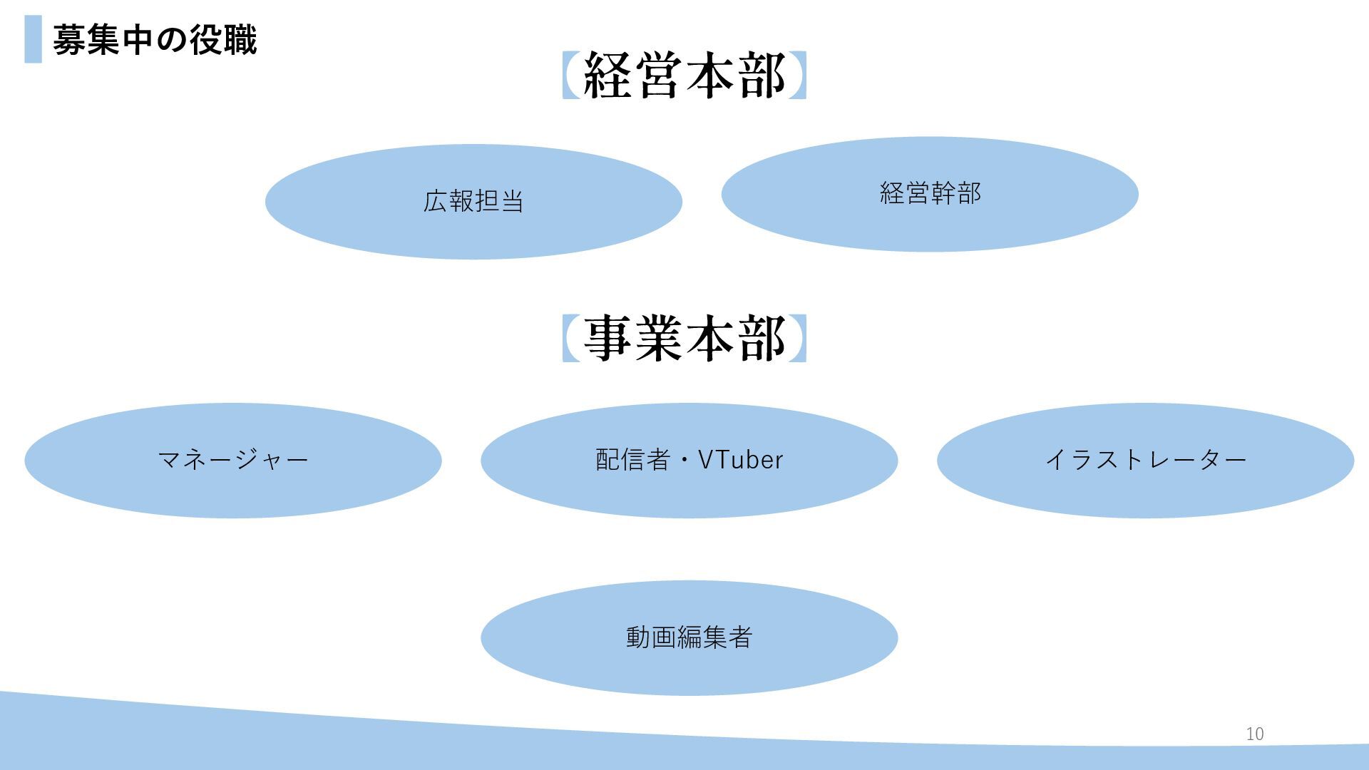 _________ 募集中の役職 【経営本部】 経営幹部 【事業本部】 マネージャー 配信者・VTuber イラストレーター 動画編集者 広報担当
