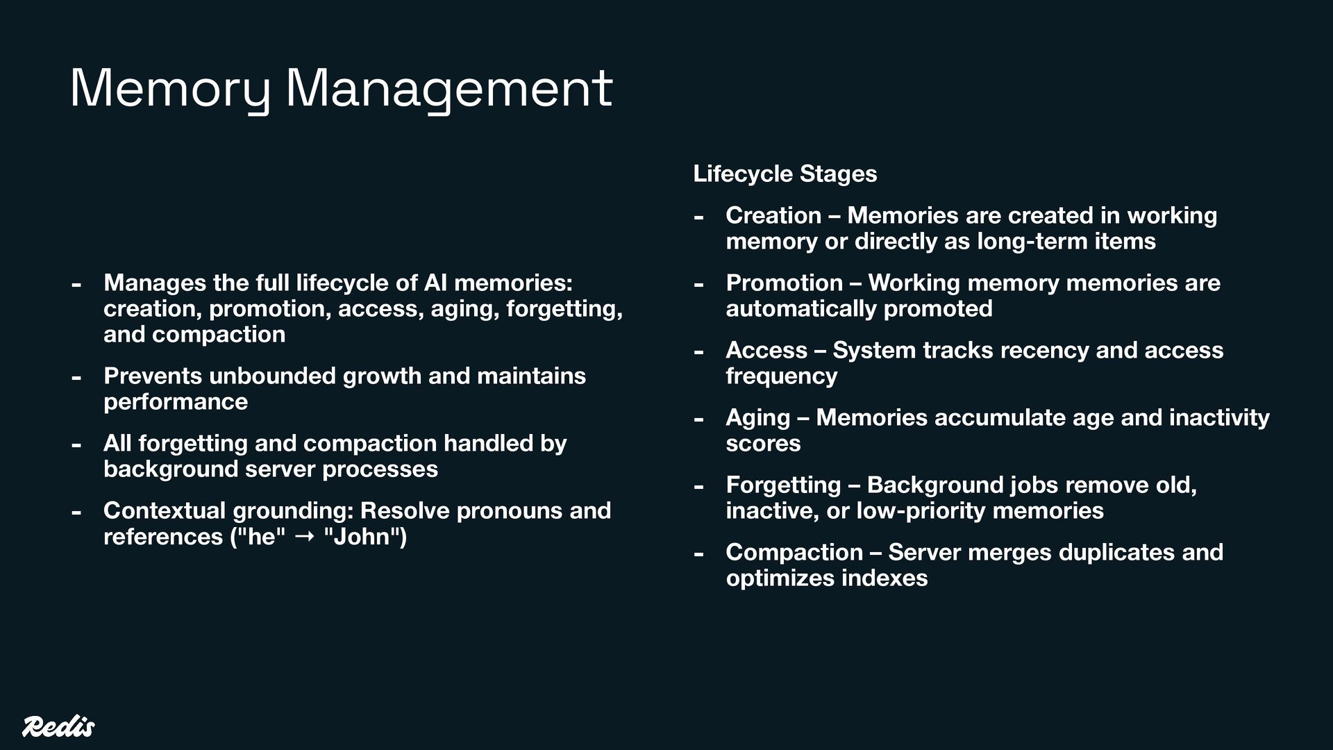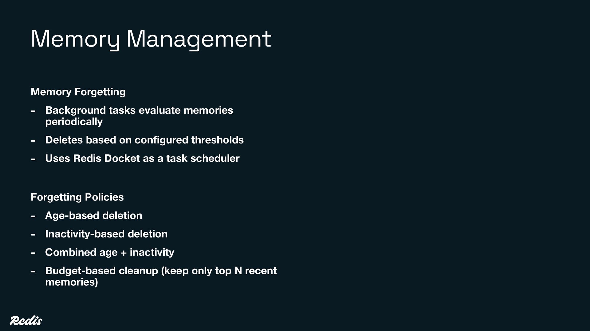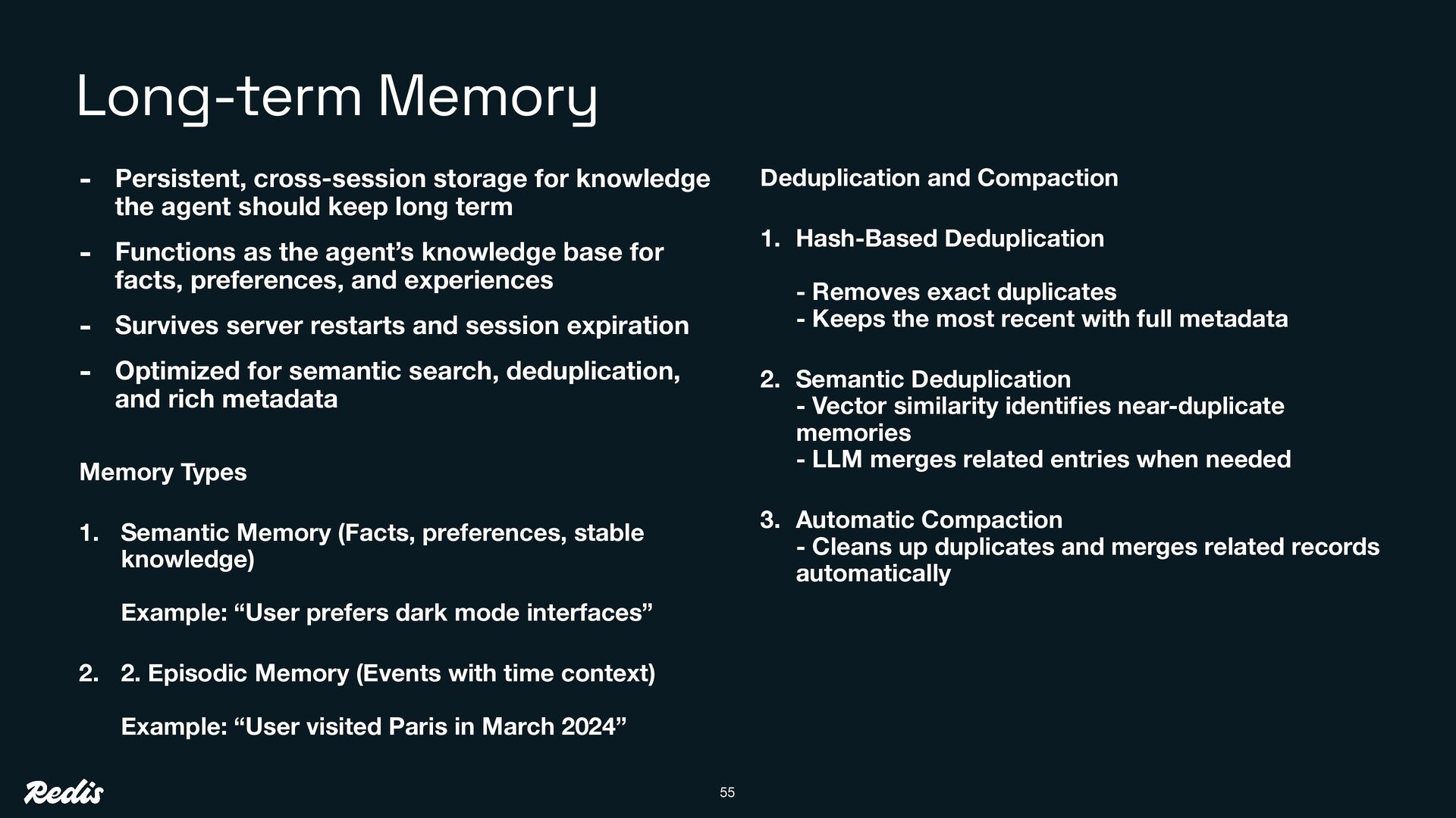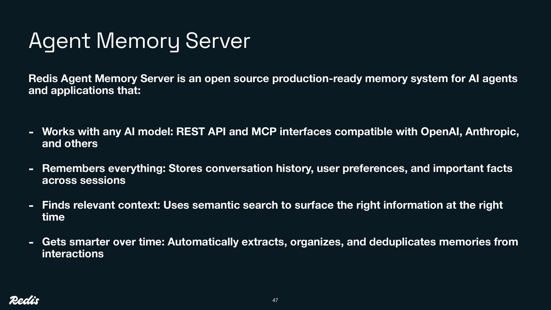 MCP interfaces compatible with OpenAI, Anthropic, and others - Remembers everything: Stores conversation history, user preferences, and important facts across sessions - Finds relevant context: Uses semantic search to surface the right information at the right time - Gets smarter over time: Automatically extracts, organizes, and deduplicates memories from interactions Agent Memory Server Redis Agent Memory Server is an open source production-ready memory system for AI agents and applications that: