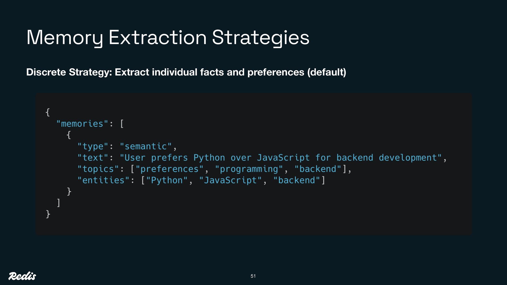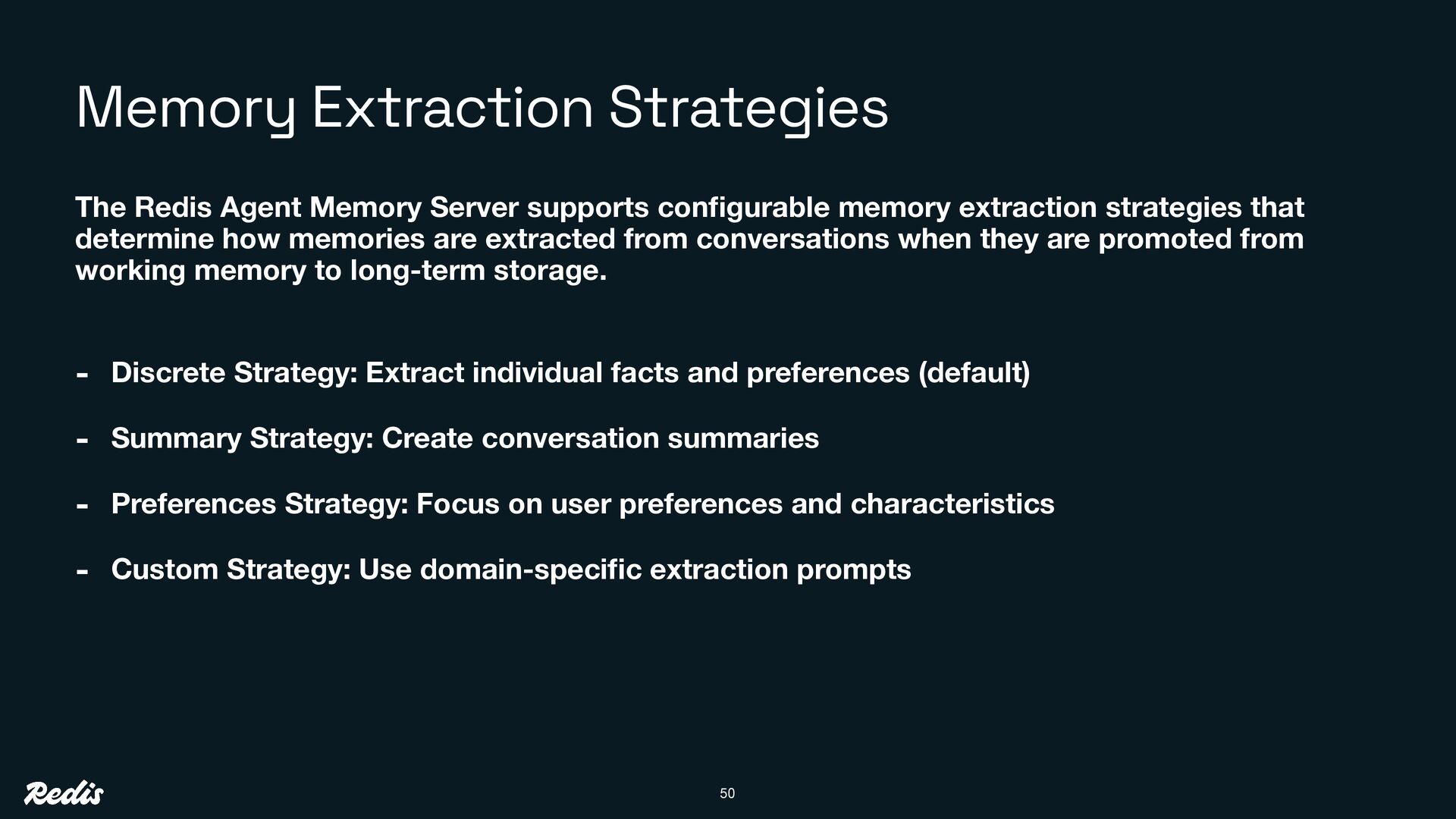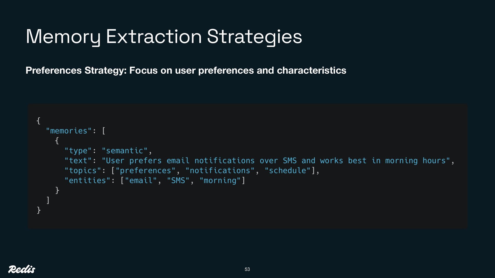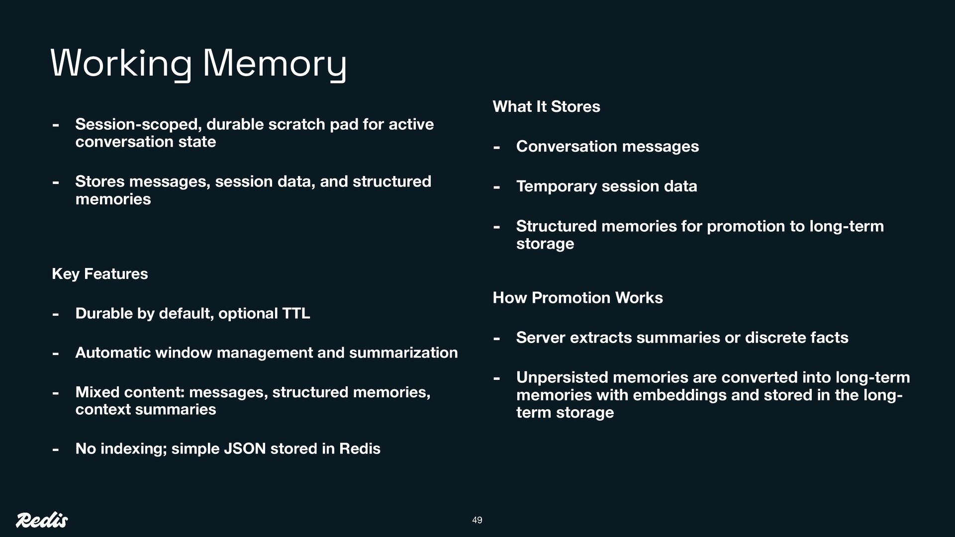 MCP interfaces compatible with OpenAI, Anthropic, and others - Remembers everything: Stores conversation history, user preferences, and important facts across sessions - Finds relevant context: Uses semantic search to surface the right information at the right time - Gets smarter over time: Automatically extracts, organizes, and deduplicates memories from interactions Agent Memory Server Redis Agent Memory Server is an open source production-ready memory system for AI agents and applications that: