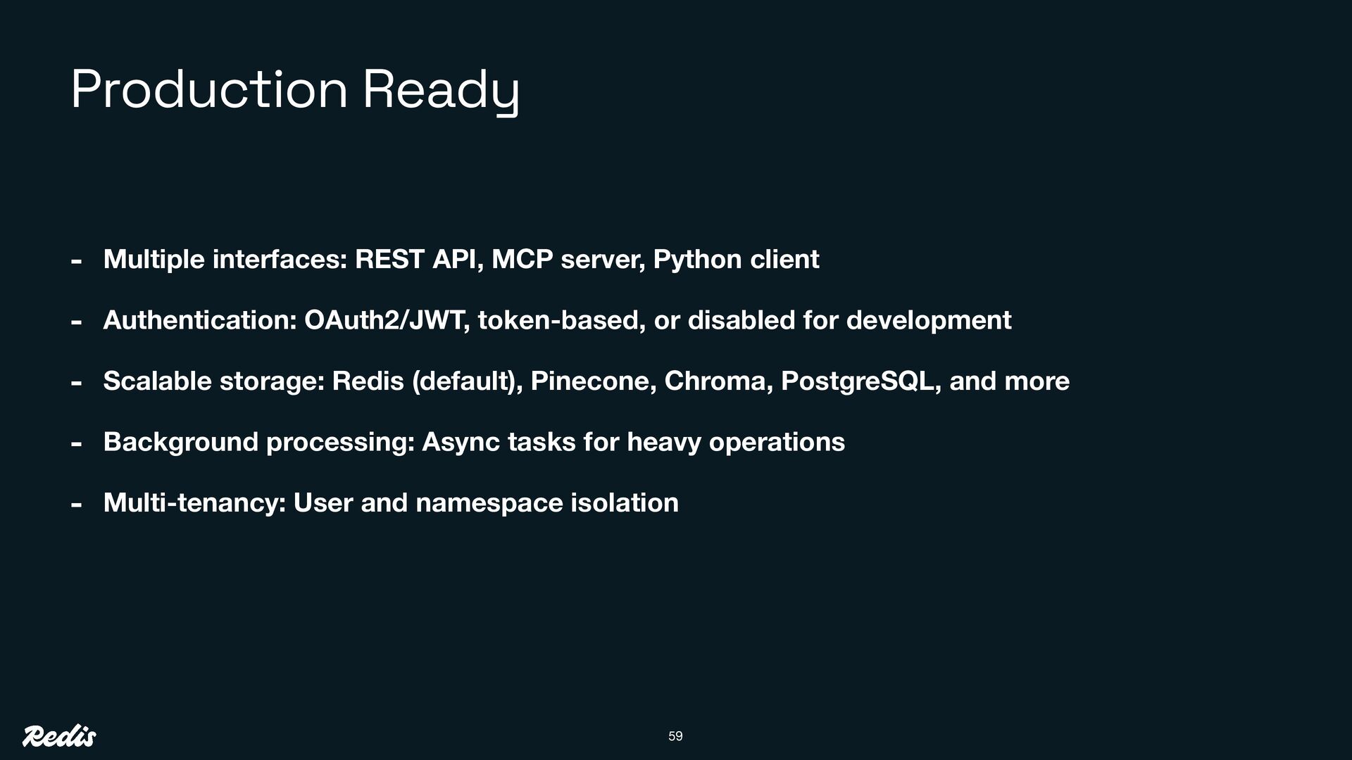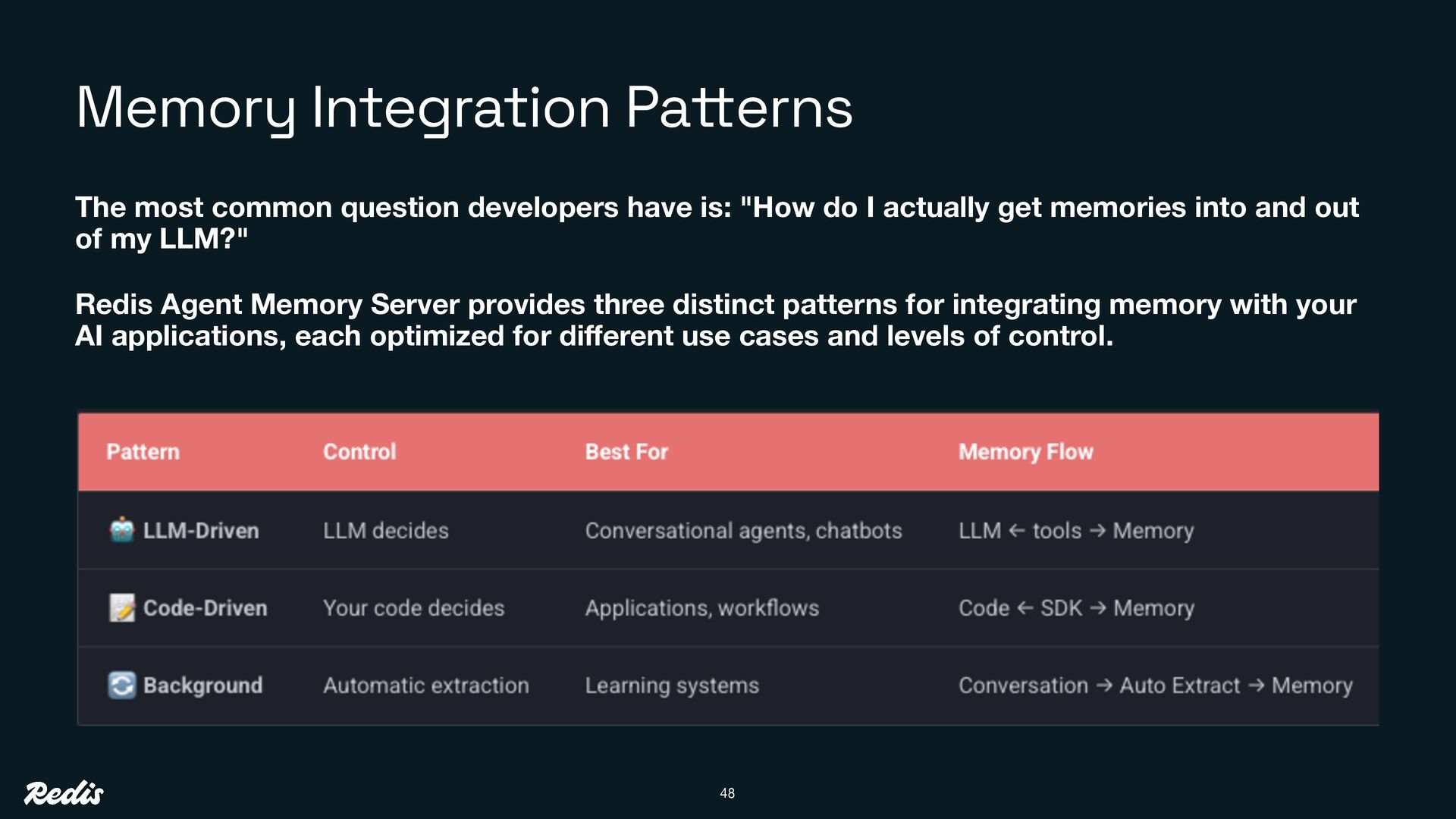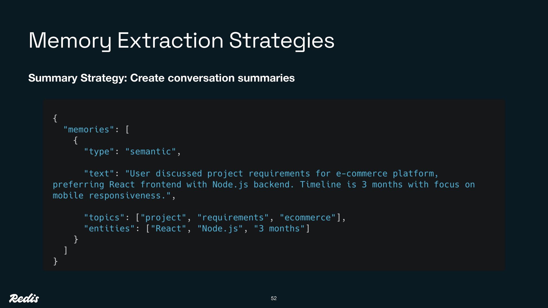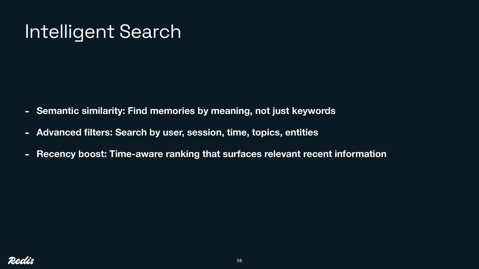 MCP interfaces compatible with OpenAI, Anthropic, and others - Remembers everything: Stores conversation history, user preferences, and important facts across sessions - Finds relevant context: Uses semantic search to surface the right information at the right time - Gets smarter over time: Automatically extracts, organizes, and deduplicates memories from interactions Agent Memory Server Redis Agent Memory Server is an open source production-ready memory system for AI agents and applications that: