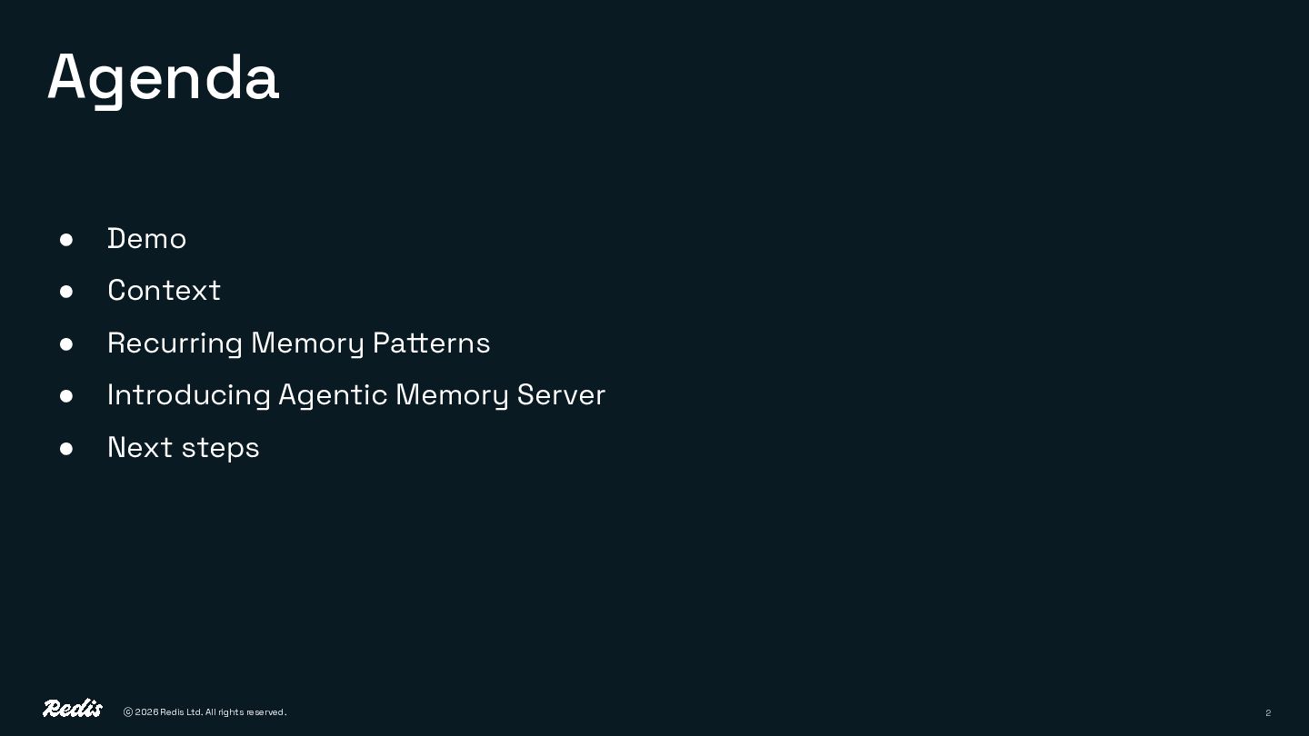 2. ⓒ 2026 Redis Ltd. All rights reserved. 2 Agenda •
