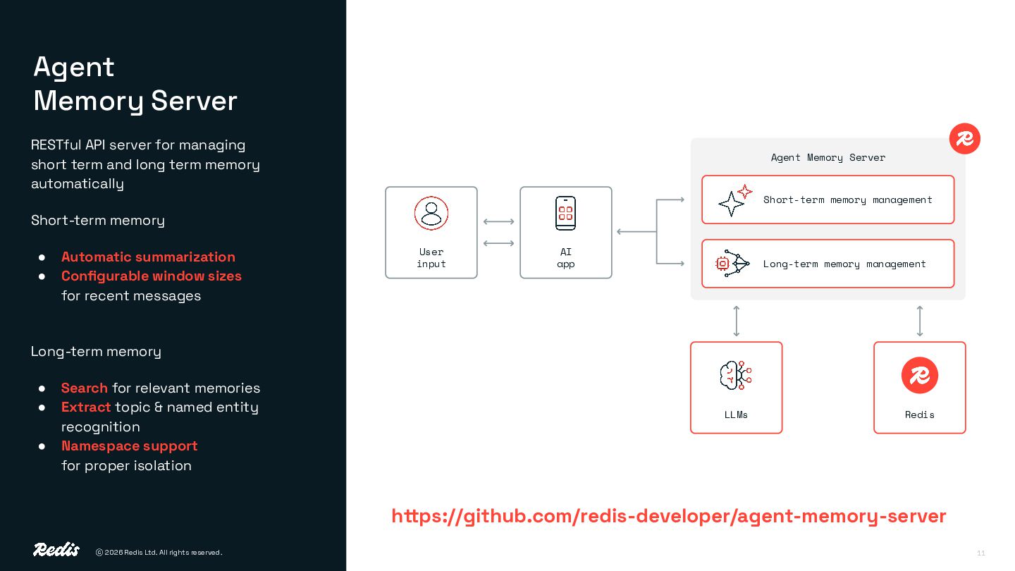 Memory Server RESTful API server for managing short term and long term memory automatically Short-term memory • Automatic summarization • Configurable window sizes for recent messages Long-term memory • Search for relevant memories • Extract topic & named entity recognition • Namespace support for proper isolation Agent Memory Server User input AI app Short-term memory management Long-term memory management LLMs https://github.com/redis-developer/agent-memory-server