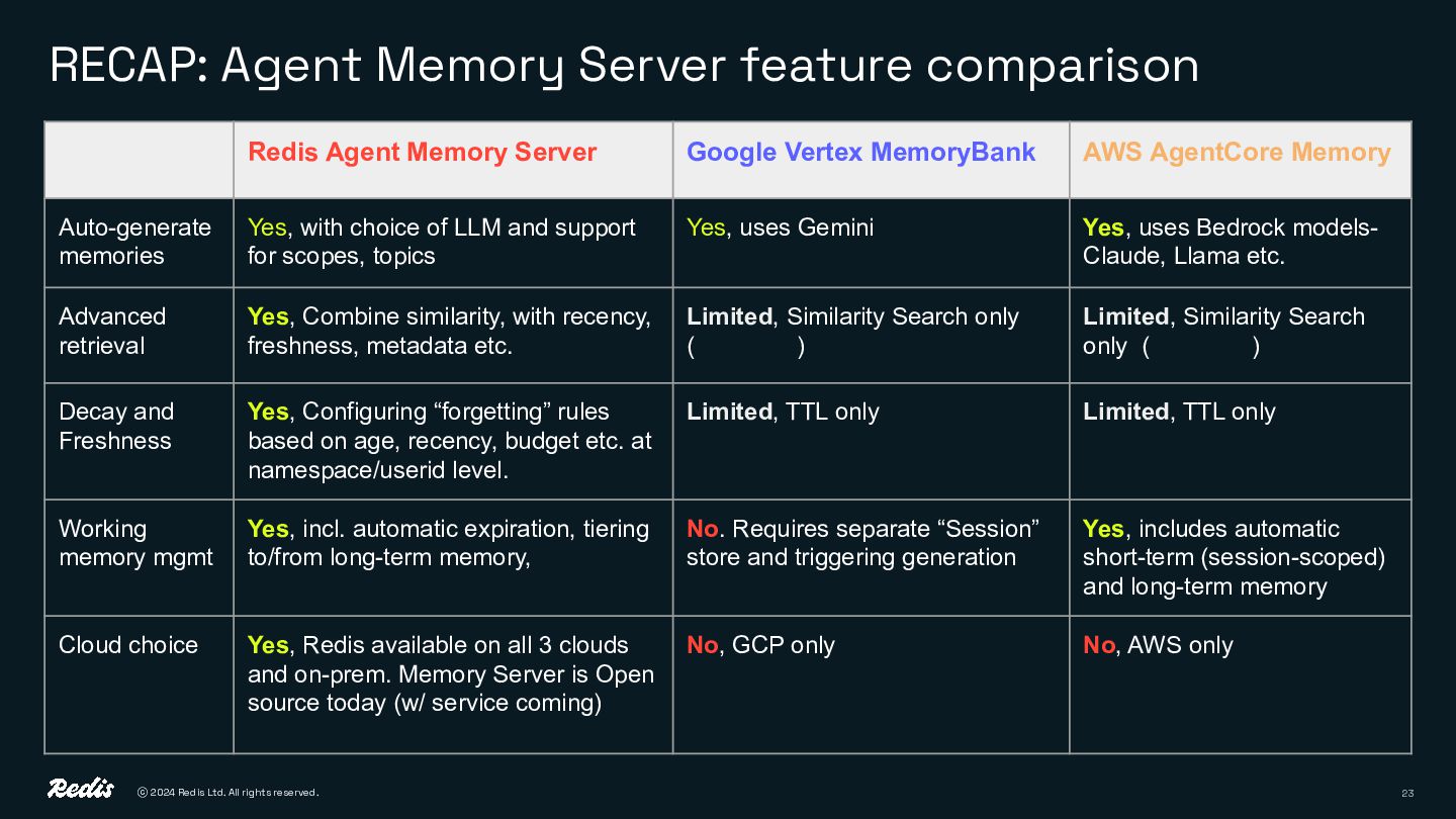 Memory Server feature comparison Redis Agent Memory Server Google Vertex MemoryBank AWS AgentCore Memory Auto-generate memories Yes, with choice of LLM and support for scopes, topics Yes, uses Gemini Yes, uses Bedrock models- Claude, Llama etc. Advanced retrieval Yes, Combine similarity, with recency, freshness, metadata etc. Limited, Similarity Search only (reference) Limited, Similarity Search only (reference) Decay and Freshness Yes, Configuring “forgetting” rules based on age, recency, budget etc. at namespace/userid level. Limited, TTL only Limited, TTL only Working memory mgmt Yes, incl. automatic expiration, tiering to/from long-term memory, No. Requires separate “Session” store and triggering generation Yes, includes automatic short-term (session-scoped) and long-term memory Cloud choice Yes, Redis available on all 3 clouds and on-prem. Memory Server is Open source today (w/ service coming) No, GCP only No, AWS only