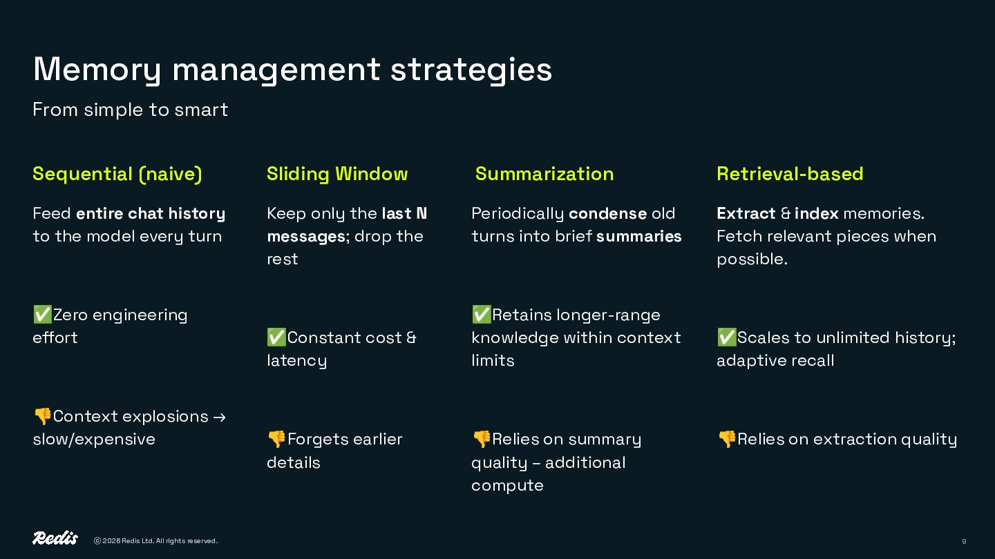 strategies Periodically condense old turns into brief summaries ✅Retains longer-range knowledge within context limits 👎Relies on summary quality – additional compute Sequential (naive) From simple to smart Keep only the last N messages; drop the rest ✅Constant cost & latency 👎Forgets earlier details Feed entire chat history to the model every turn ✅Zero engineering effort 👎Context explosions → slow/expensive Sliding Window Summarization Extract & index memories. Fetch relevant pieces when possible. ✅Scales to unlimited history; adaptive recall 👎Relies on extraction quality Retrieval-based