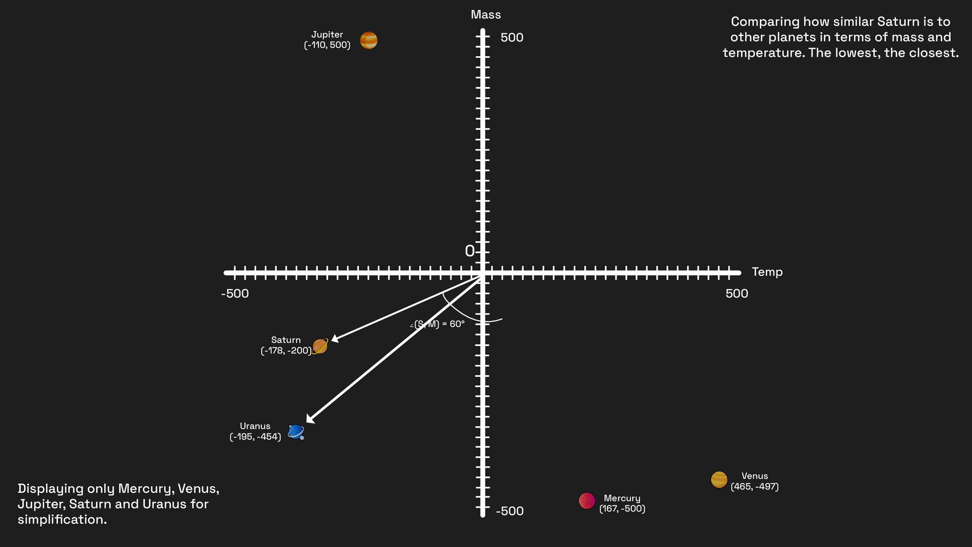 Displaying only Mercury, Venus, Jupiter, Saturn and Uranus for simpli fi cation. Comparing how similar Saturn is to other planets in terms of mass and temperature. The lowest, the closest. Mercury (167, -500) Venus (465, -497) Saturn (-178, -200) Uranus (-195, -454) ∠(S, M) = 60°
