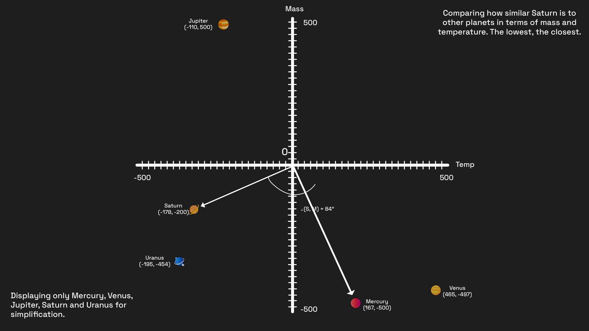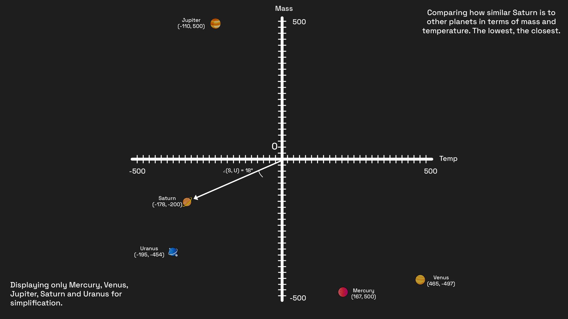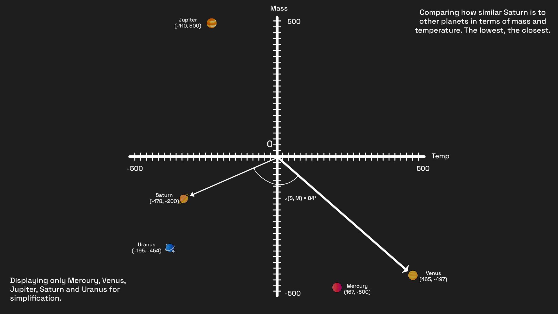 Displaying only Mercury, Venus, Jupiter, Saturn and Uranus for simpli fi cation. Comparing how similar Saturn is to other planets in terms of mass and temperature. The lowest, the closest. Mercury (167, -500) Venus (465, -497) Saturn (-178, -200) Uranus (-195, -454) ∠(S, M) = 84°