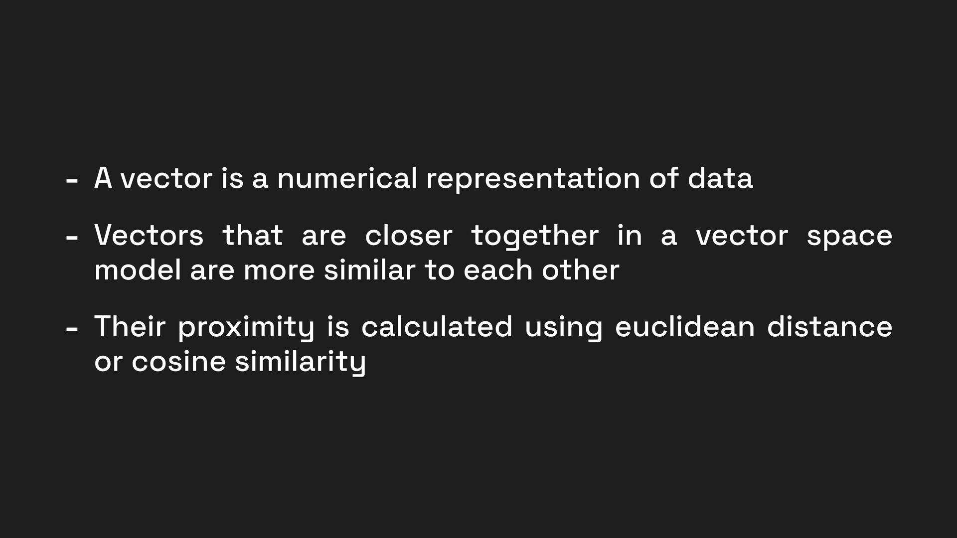 Vectors that are closer together in a vector space model are more similar to each other - Their proximity is calculated using euclidean distance or cosine similarity