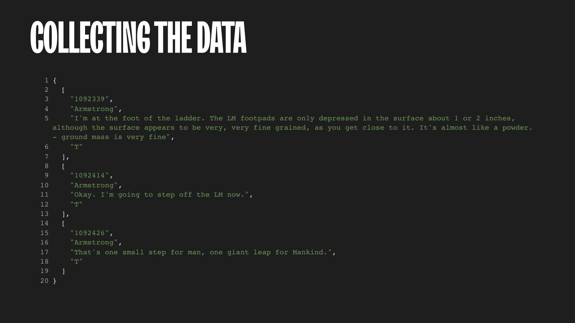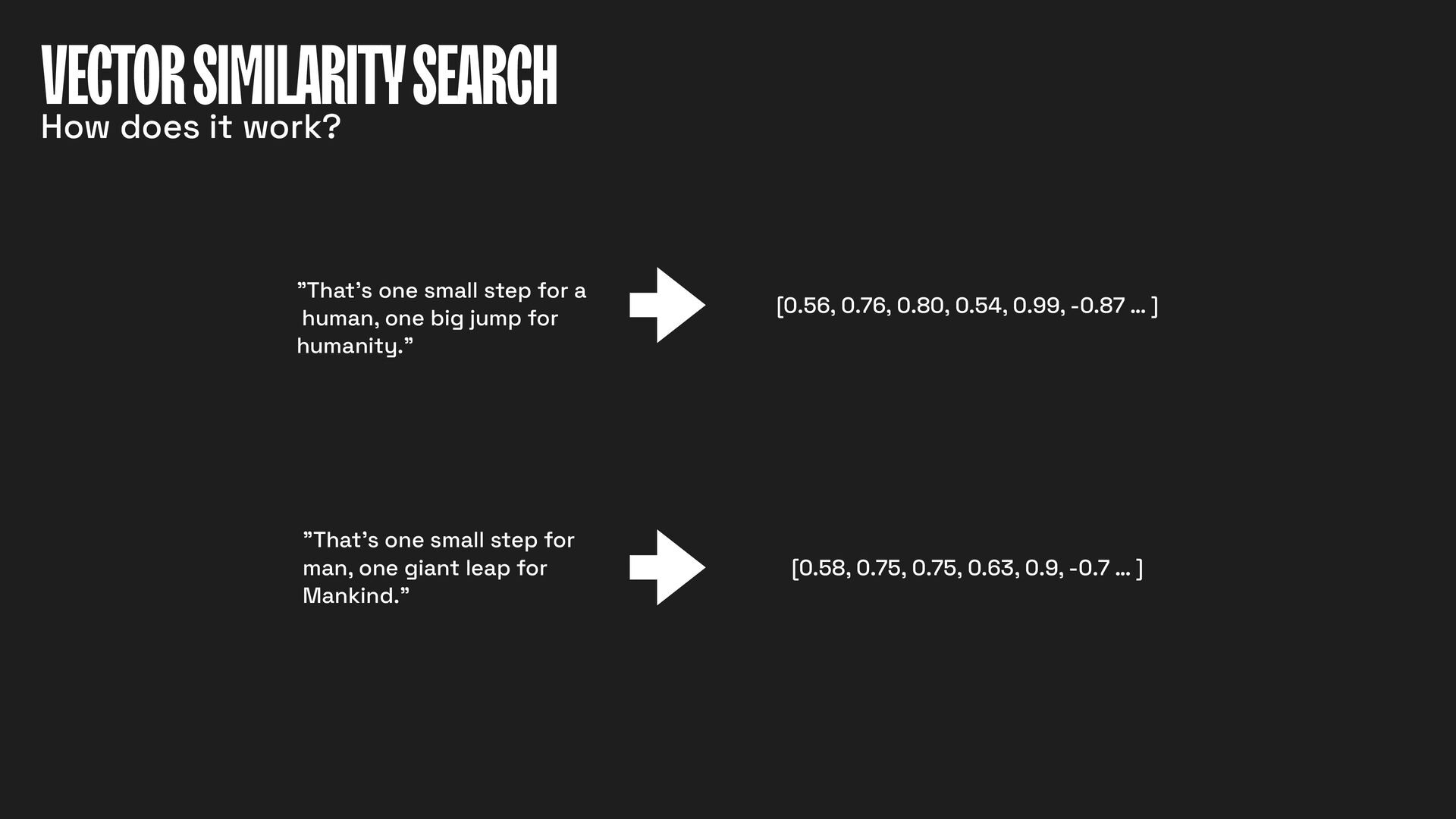 step for man, one giant leap for Mankind." "That's one small step for a human, one big jump for humanity.” [0.56, 0.76, 0.80, 0.54, 0.99, -0.87 … ] [0.58, 0.75, 0.75, 0.63, 0.9, -0.7 … ]