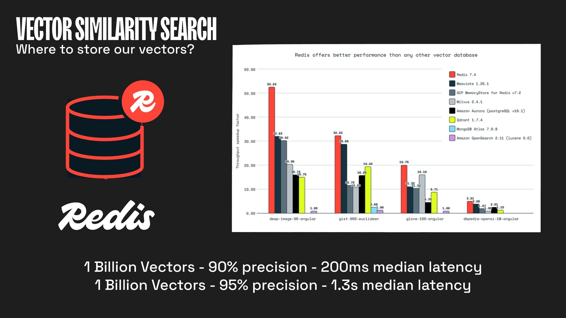 Vectors - 90% precision - 200ms median latency 1 Billion Vectors - 95% precision - 1.3s median latency