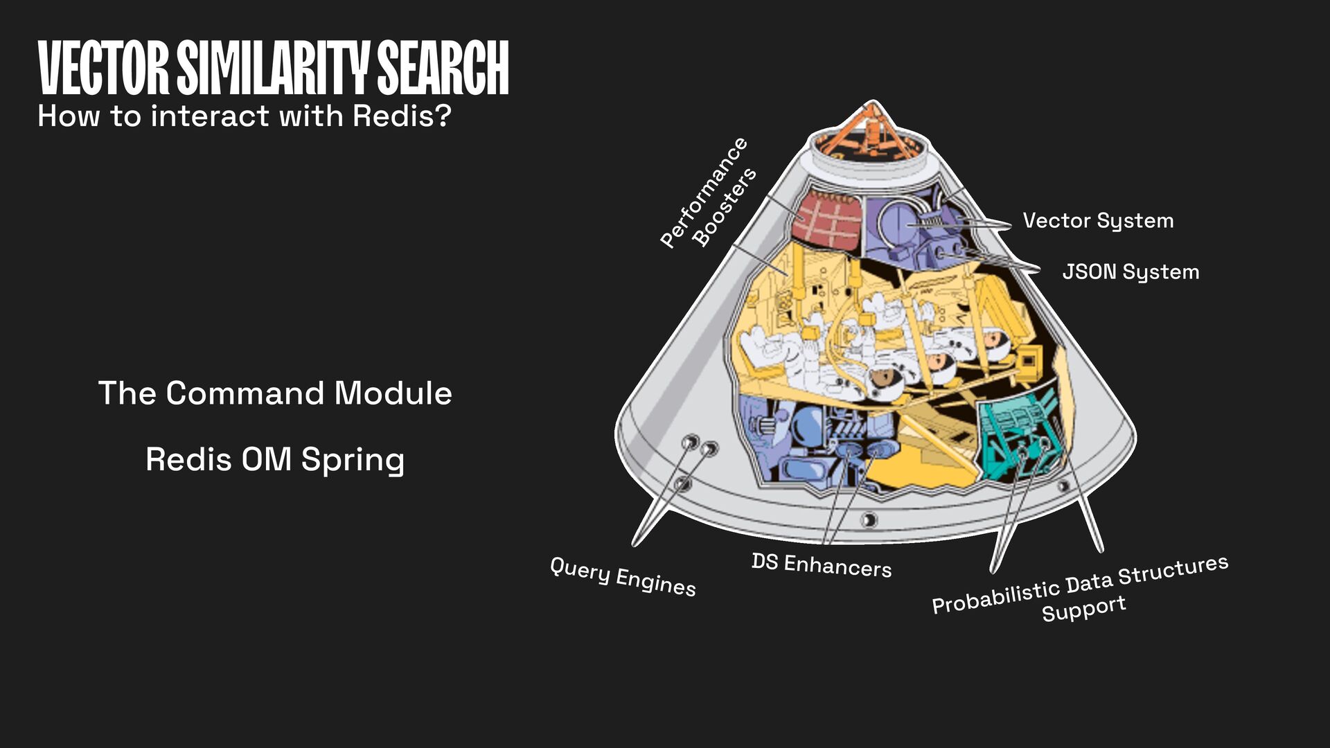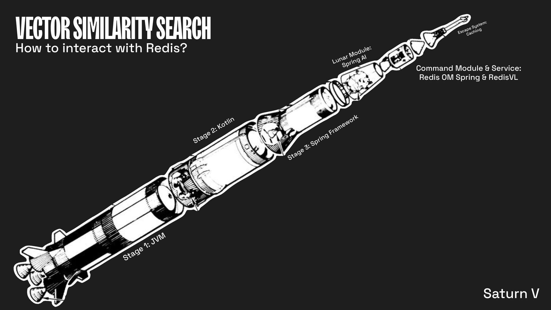 Stage 1: JVM Stage 2: Kotlin Stage 3: Spring Framework Command Module & Service: Redis OM Spring & RedisVL Lunar Module: Spring AI Escape System: Caching