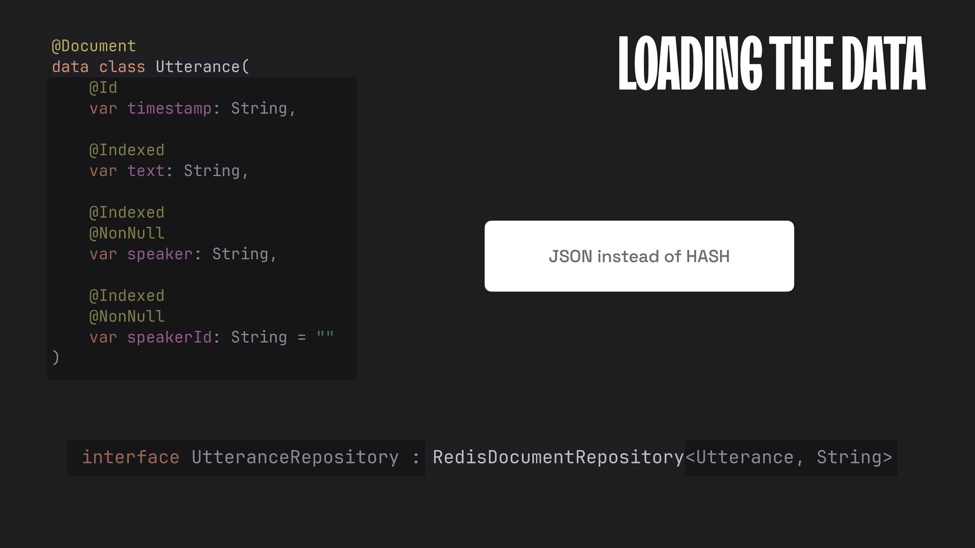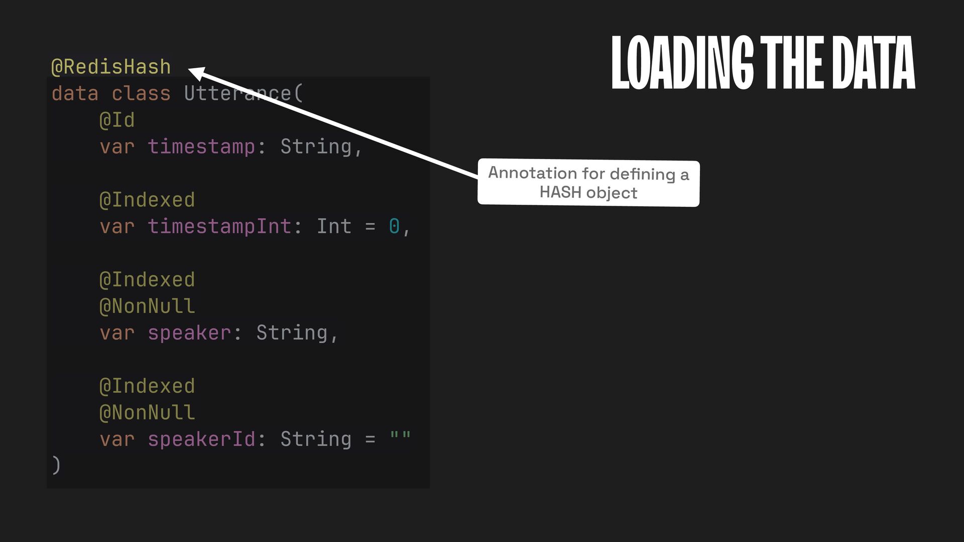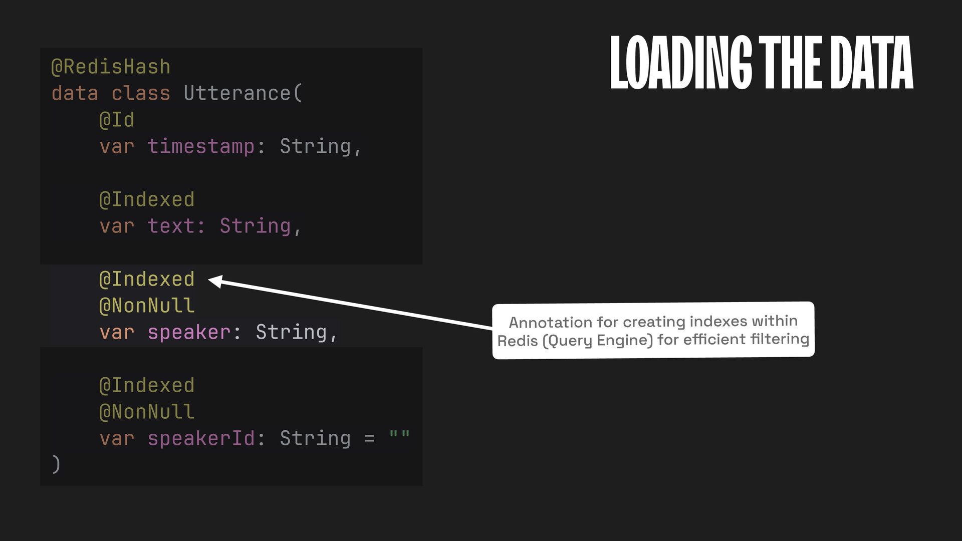 text: String, @Indexed @NonNull var speaker: String, @Indexed @NonNull var speakerId: String = "" ) LOADING THE DATA Annotation for creating indexes within Redis (Query Engine) for e ff i cient fi ltering