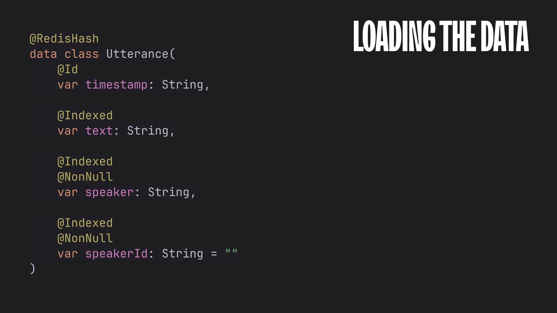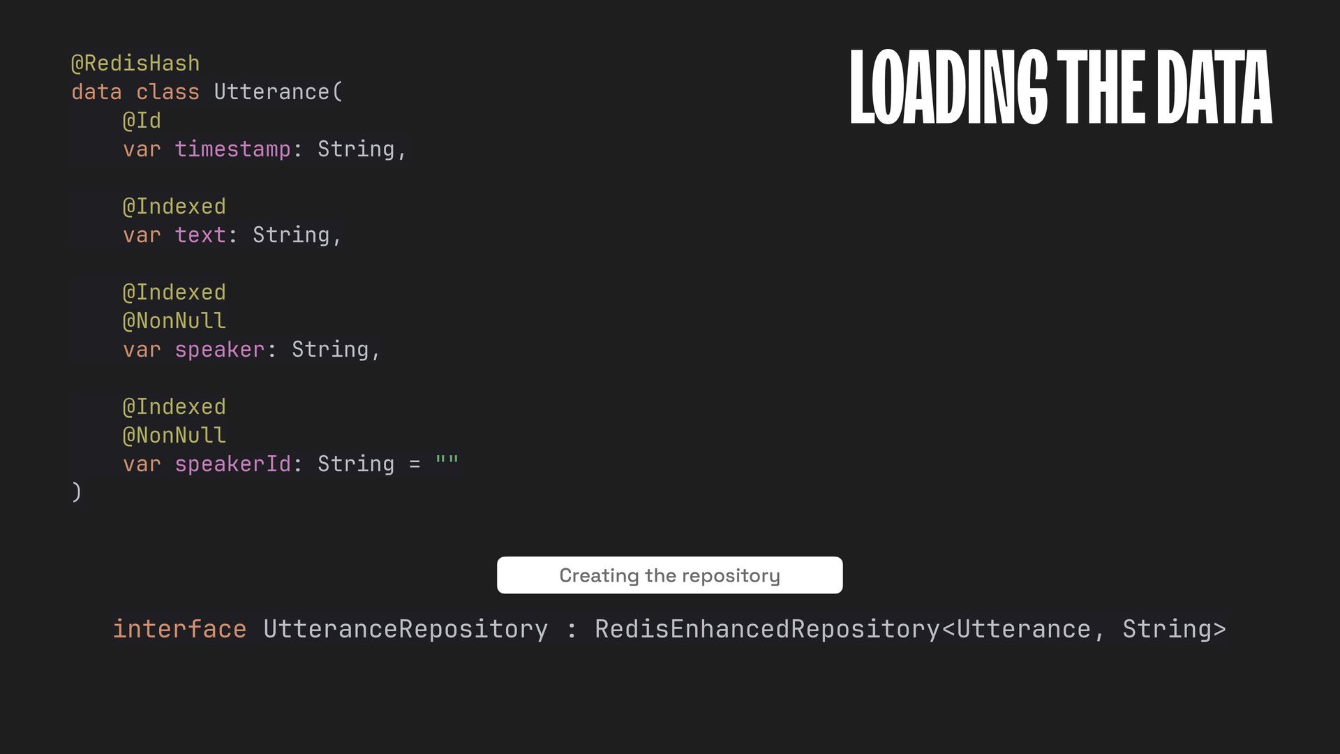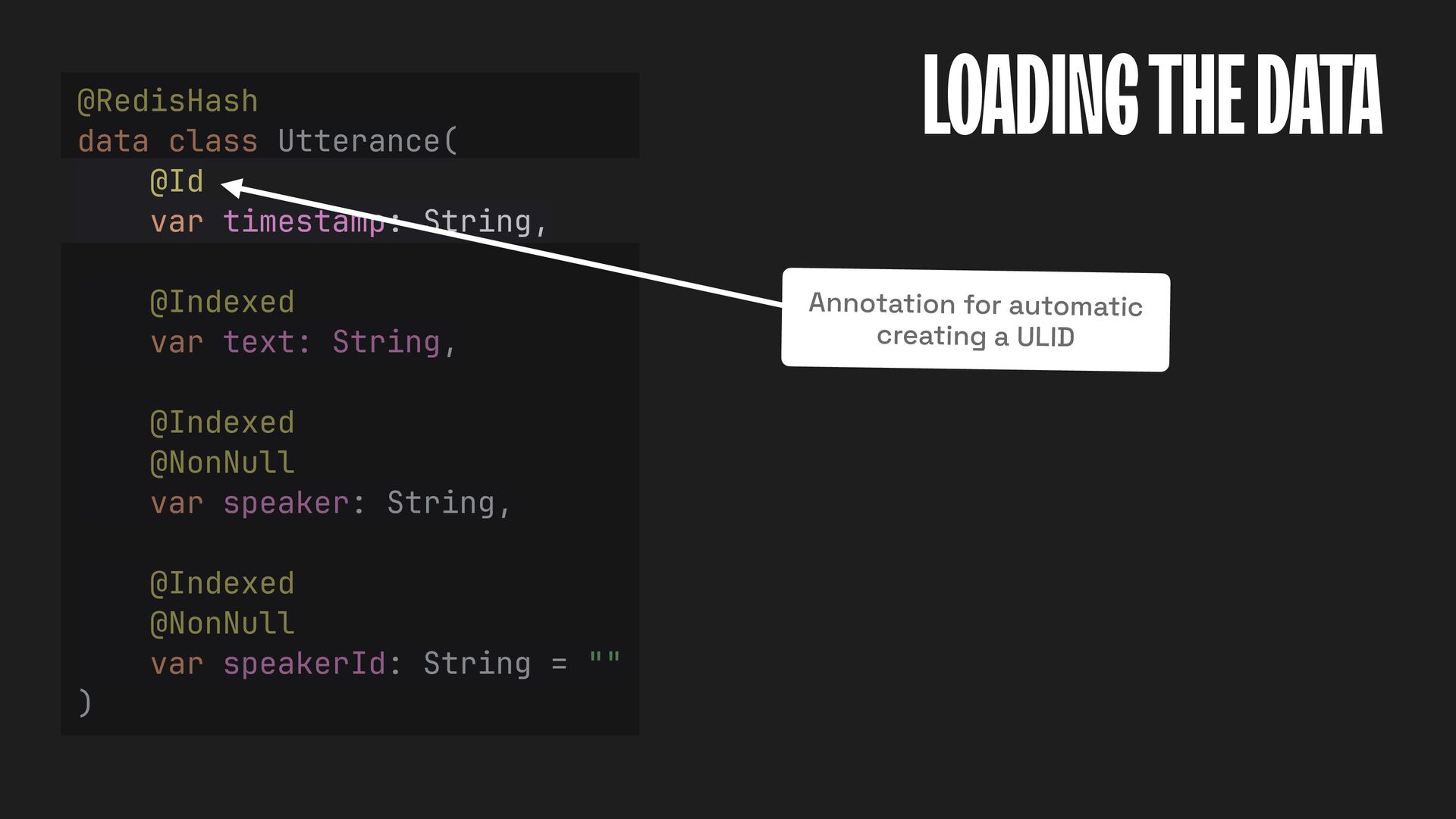 text: String, @Indexed @NonNull var speaker: String, @Indexed @NonNull var speakerId: String = "" ) LOADING THE DATA Annotation for creating indexes within Redis (Query Engine) for e ff i cient fi ltering